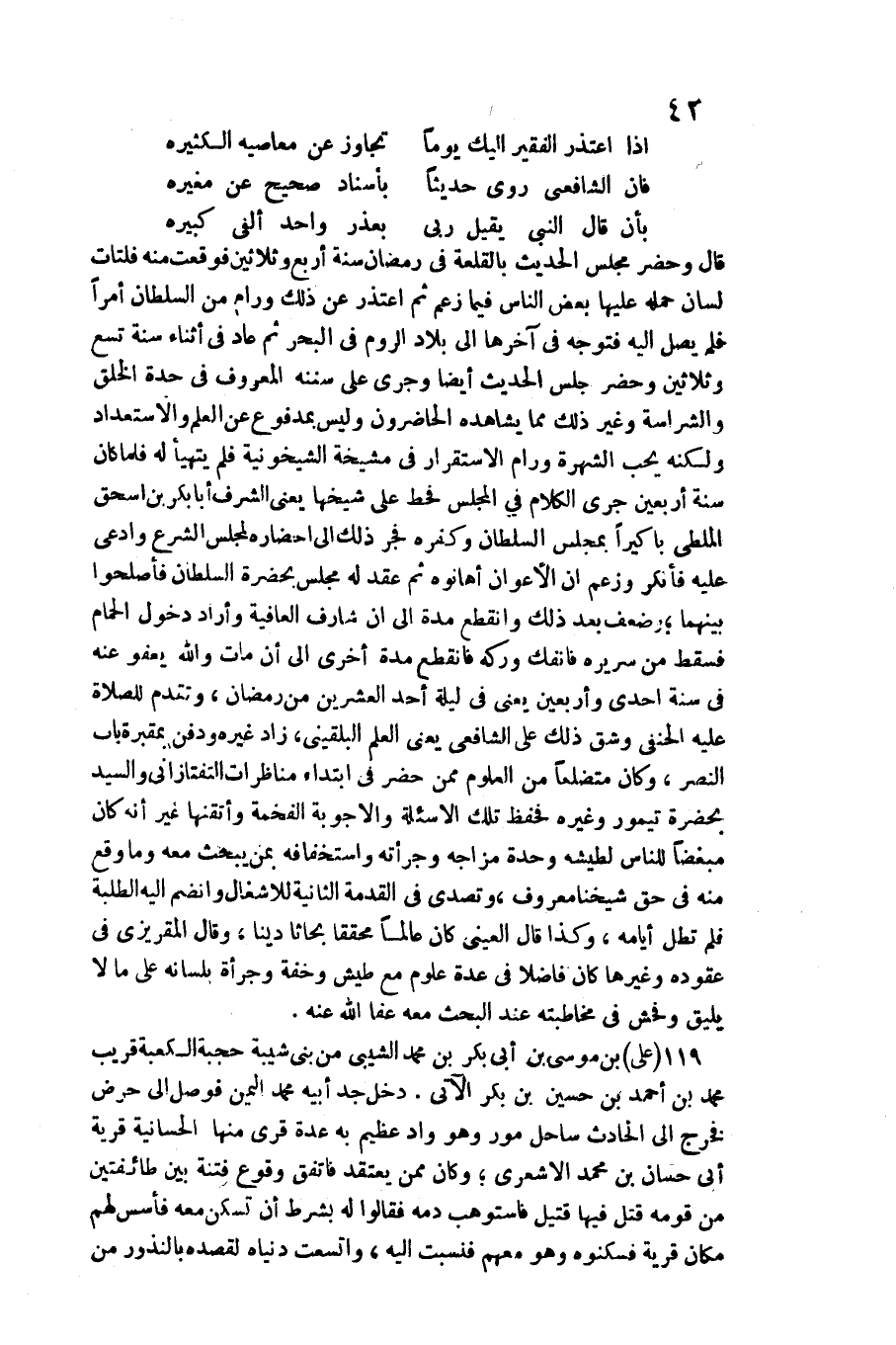 بمدفوع عَن الْعلم والاستعداد وَلكنه يحب الشُّهْرَة ورام الِاسْتِقْرَار فِي مشيخة الشيخونية فَلم يتهيأ لَهُ فَلَمَّا كَانَ سنة أَرْبَعِينَ جرى الْكَلَام فِي الْمجْلس فحط على شيخها يَعْنِي الشّرف أَبَا بكر بن إِسْحَق الْمَلْطِي باكيرا بِمَجْلِس السُّلْطَان وكفره فجر ذَلِك إِلَى إِحْضَاره لمجلس الشَّرْع وَادّعى عَلَيْهِ فَأنْكر وَزعم أَن الأعوان أهانوه ثمَّ عقد لَهُ مجْلِس بِحَضْرَة السُّلْطَان فأصلحوا بَينهمَا وَضعف بعد ذَلِك وَانْقطع مُدَّة إِلَى أَن شَارف الْعَافِيَة وَأَرَادَ دُخُول الْحمام فَسقط من سَرِيره فانفك وركه فَانْقَطع مُدَّة أُخْرَى إِلَى أَن مَاتَ وَالله يعْفُو عَنهُ فِي سنة إِحْدَى وَأَرْبَعين يَعْنِي فِي لَيْلَة أحد الْعشْرين من رَمَضَان، وَتقدم للصَّلَاة عَلَيْهِ الْحَنَفِيّ وشق ذَلِك على الشَّافِعِي يَعْنِي الْعلم البُلْقِينِيّ، زَاد غَيره وَدفن بمقبرة بَاب النَّصْر، وَكَانَ متضلعا من الْعُلُوم مِمَّن حضر فِي ابْتِدَاء مناظرات التَّفْتَازَانِيّ وَالسَّيِّد بِحَضْرَة تيمور وَغَيره فحفظ تِلْكَ الأسئلة والأجوبة الفخمة وأتقنها غير أَنه كَانَ مبغضا للنَّاس لطيشه وحدة مزاجه وجرأته واستخفافه بِمن يبْحَث مَعَه وَمَا وَقع مِنْهُ فِي حق شَيخنَا مَعْرُوف، وتصدى فِي القدمة الثَّانِيَة للإشغال وانضم إِلَيْهِ الطّلبَة فَلم تطل أَيَّامه، وَكَذَا قَالَ الْعَيْنِيّ: كَانَ عَالما محققا بحاثا دينا، وَقَالَ المقريزي فِي عقوده وَغَيرهَا: كَانَ فَاضلا فِي عدَّة عُلُوم مَعَ طيش وخفة وجرأة بِلِسَانِهِ على مَا لَا يَلِيق وفحش فِي مخاطبته عِنْد الْبَحْث مَعَه عَفا الله عَنهُ.