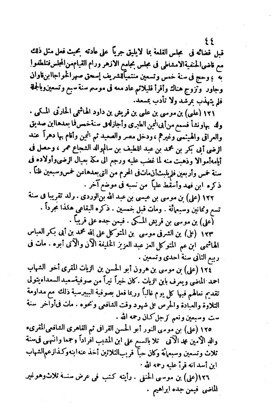 عَليّ بن مُوسَى بن عَليّ بن قُرَيْش بن دَاوُد الْهَاشِمِي الْحَارِثِيّ الْمَكِّيّ. ولد بهَا وَنَشَأ فَسمع من أبي الْيمن الطَّبَرِيّ وَأَجَازَ لَهُ فِي سنة خمس فَمَا بعْدهَا ابْن صديق والعراقي والهيثمي وعيرهم، وَدخل مصر والصعيد ثمَّ الْيمن وَأقَام بهَا دهرا عِنْد الرضى أبي بكر بن مُحَمَّد بن عبد اللَّطِيف بن سَالم وَالِد الشجاع عمر، وَحصل فِي أَيَّامه أَمْوَالًا وَذَهَبت مِنْهُ لما غضب عَلَيْهِ وَرجع إِلَى مَكَّة بعيال الرضى وَأَوْلَاده فِي سنة خمس وَأَرْبَعين فَلم يلبث أَن مَاتَ فِي الْمحرم من الَّتِي بعْدهَا عَن خمس وَسبعين ظنا. ذكره ابْن فَهد وَأسْقط عليا من نسبه فِي مَوضِع آخر.