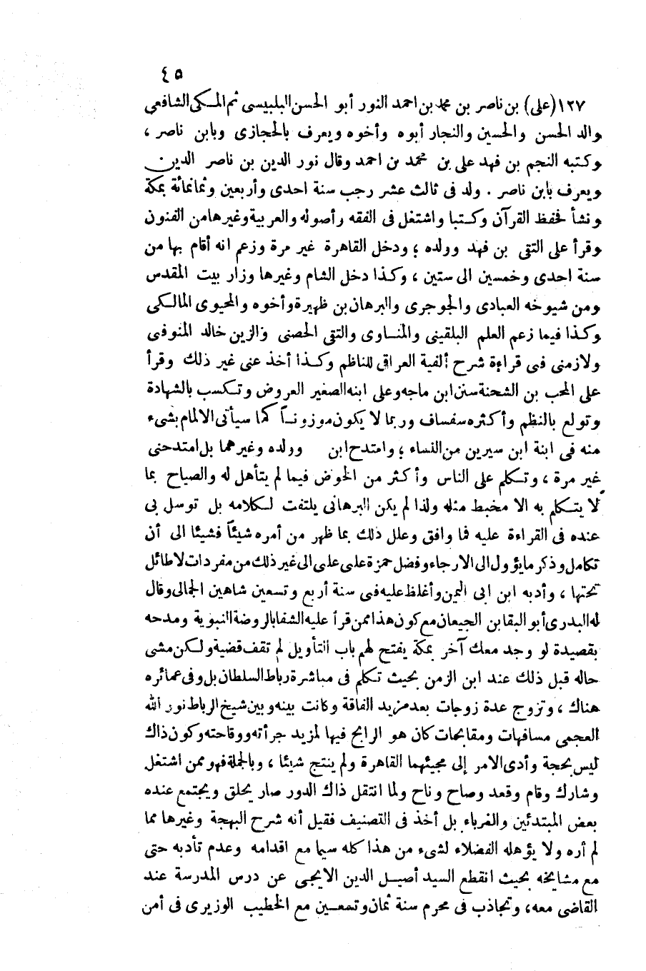 عَليّ بن نَاصِر بن مُحَمَّد بن أَحْمد النُّور أَبُو الْحسن البلبيسي ثمَّ الْمَكِّيّ الشَّافِعِي وَالِد الْحسن وَالْحُسَيْن والنجار أَبوهُ وَأَخُوهُ وَيعرف بالحجازي وبابن نَاصِر، وَكتبه النَّجْم بن فَهد عَليّ بن مُحَمَّد بن أَحْمد وَقَالَ: نور الدّين بن نَاصِر الدّين وَيعرف بِابْن نَاصِر. ولد فِي ثَالِث عشر رَجَب سنة إِحْدَى وَأَرْبَعين وَثَمَانمِائَة بِمَكَّة وَنَشَأ فحفظ الْقُرْآن وكتبا واشتغل فِي الْفِقْه وأصوله والعربية وَغَيرهَا من الْفُنُون)