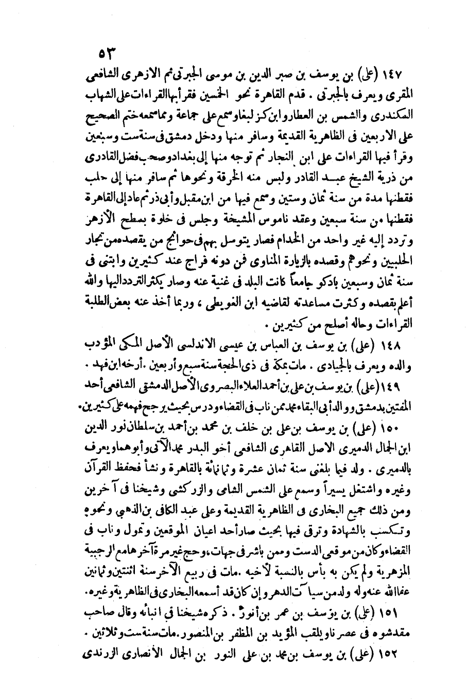 عَليّ بن يُوسُف بن صَبر الدّين بن مُوسَى الجبرتي ثمَّ الْأَزْهَرِي الشَّافِعِي الْمقري وَيعرف بالجبرتي. قدم الْقَاهِرَة نَحْو الْخمسين فَقَرَأَ بهَا الْقرَاءَات على الشهَاب السكندري وَالشَّمْس بن الْعَطَّار وَابْن كزلبغا وَسمع على جمَاعَة وَمِمَّا سَمعه ختم الصَّحِيح على الْأَرْبَعين فِي الظَّاهِرِيَّة الْقَدِيمَة وسافر مِنْهَا وَدخل دمشق فِي سنة سِتّ وَسبعين وَقَرَأَ فِيهَا الْقرَاءَات على ابْن النجار ثمَّ توجه مِنْهَا إِلَى بَغْدَاد وَصَحب فضل القادري من ذُرِّيَّة الشَّيْخ عبد الْقَادِر وَلبس مِنْهُ الْخِرْقَة وَنَحْوهَا ثمَّ سَافر مِنْهَا إِلَى حلب فقطنها مُدَّة من سنة ثَمَان وَسِتِّينَ وَسمع فِيهَا من ابْن مقبل وَأبي ذَر ثمَّ عَاد إِلَى الْقَاهِرَة فقطنها من سنة سبعين وَعقد ناموس المشيخة وَجلسَ فِي خلْوَة بسطح الْأَزْهَر وَتردد إِلَيْهِ غير وَاحِد من الخدام فَصَارَ يتوسل بهم فِي حوائج من يَقْصِدهُ من تجار الحلبيين وَنَحْوهم وقصده بالزيارة الْمَنَاوِيّ فَمن دونه عِنْد كثيرين وابتنى فِي سنة ثَمَان وَسبعين بأدكو جَامعا كَانَت الْبَلَد فِي غنية عَنهُ وَصَارَ يكثر التَّرَدُّد إِلَيْهَا وَالله أعلم بِقَصْدِهِ وَكَثُرت مساعدته لقاضيه ابْن الغويطي، وَرُبمَا أَخذ عَنهُ بعض الطّلبَة الْقرَاءَات وحاله أصلح من كثيرين.