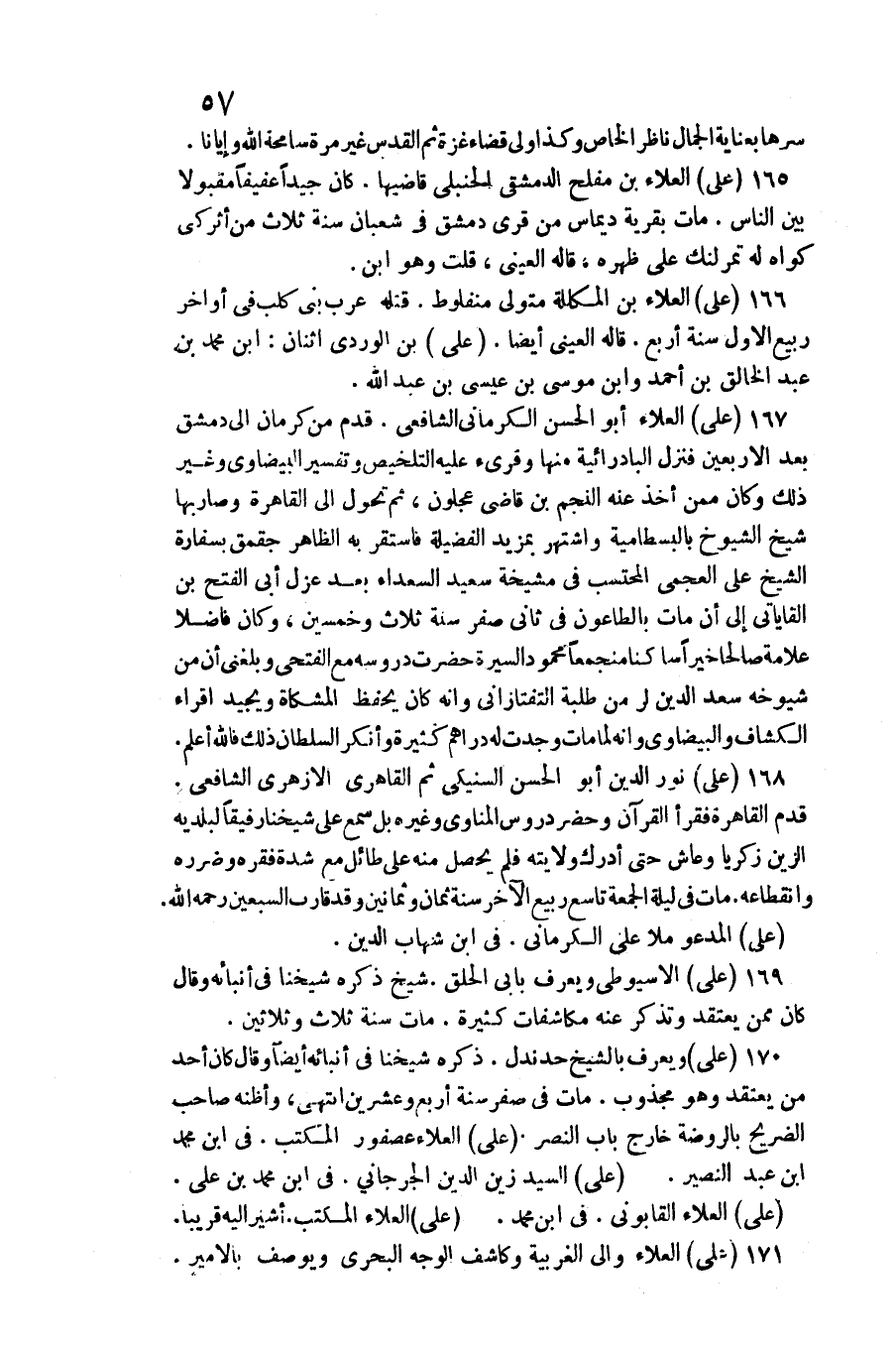 عَليّ الْعَلَاء أَبُو الْحسن الْكرْمَانِي الشَّافِعِي. قدم من كرمان إِلَى دمشق بعد الْأَرْبَعين فَنزل البادرائية مِنْهَا وَقُرِئَ عَلَيْهِ التَّلْخِيص وَتَفْسِير الْبَيْضَاوِيّ وَغير ذَلِك وَكَانَ مِمَّن أَخذ عَنهُ النَّجْم بن قَاضِي عجلون، ثمَّ تحول إِلَى الْقَاهِرَة وَصَارَ بهَا شيخ الشُّيُوخ بالبسطامية واشتهر بمزيد الْفَضِيلَة فاستقر بِهِ الظَّاهِر جقمق بسفارة الشَّيْخ على العجمي الْمُحْتَسب فِي مشيخة سعيد السُّعَدَاء بعد عزل أبي الْفَتْح بن القاياتي إِلَى أَن مَاتَ بالطاعون فِي ثَانِي صفر سنة ثَلَاث وَخمسين، وَكَانَ فَاضلا عَلامَة صَالحا خيرا سَاكِنا منجمعا مَحْمُود السِّيرَة حضرت دروسه مَعَ الفتحي وَبَلغنِي أَن من شُيُوخه سعد الدّين لر من طلبة التَّفْتَازَانِيّ وَأَنه كَانَ يحفظ الْمشكاة ويجيد إقراء الْكَشَّاف والبيضاوي وَأَنه لما مَاتَ وجدت لَهُ دَرَاهِم كَثِيرَة وَأنكر السُّلْطَان ذَلِك فَالله أعلم.