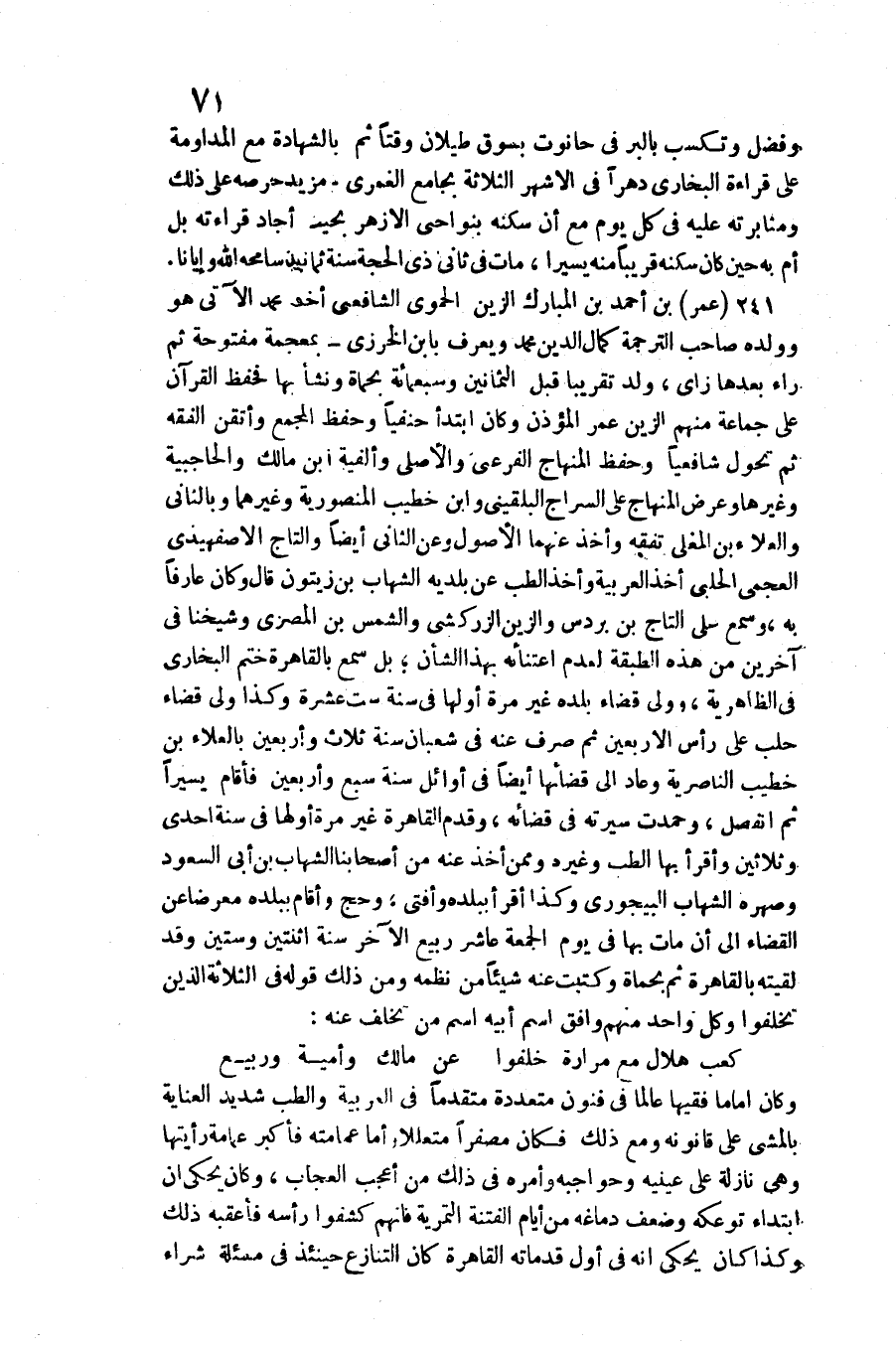 عمر بن أَحْمد بن الْمُبَارك الزين الْحَمَوِيّ الشَّافِعِي أَخذ مُحَمَّد الْآتِي هُوَ وَولده صَاحب التَّرْجَمَة كَمَال الدّين مُحَمَّد وَيعرف بِابْن الخرزي بِمُعْجَمَة مَفْتُوحَة ثمَّ رَاء بعْدهَا زَاي، ولد تَقْرِيبًا قبل الثَّمَانِينَ وَسَبْعمائة بحماة وَنَشَأ بهَا فحفظ الْقُرْآن على جمَاعَة مِنْهُم الزين عمر الْمُؤَذّن وَكَانَ ابْتَدَأَ حنفيا وَحفظ الْمجمع وأتقن الْفِقْه ثمَّ تحول شافعيا وَحفظ الْمِنْهَاج الفرعي والأصلي وألفية ابْن مَالك والحاجبية وَغَيرهَا وَعرض الْمِنْهَاج على السراج البُلْقِينِيّ وَابْن خطيب المنصورية وَغَيرهمَا وبالناني والْعَلَاء بن المغلي تفقه وَأخذ عَنْهُمَا الْأُصُول وَعَن الثَّانِي أَيْضا والتاج الأصفهيدي العجمي الْحلَبِي أَخذ الْعَرَبيَّة وَأخذ الطِّبّ عَن بلديه الشهَاب بن زيتون قَالَ وَكَانَ عَارِفًا بِهِ، وَسمع على التَّاج بن بردس والزين الزَّرْكَشِيّ وَالشَّمْس بن الْمصْرِيّ وَشَيخنَا فِي آخَرين من هَذِه الطَّبَقَة لعدم اعتنائه بِهَذَا الشَّأْن بل سمع بِالْقَاهِرَةِ ختم البُخَارِيّ فِي الظَّاهِرِيَّة، وَولي قَضَاء بَلَده غير مرّة أَولهَا فِي سنة سِتّ عشرَة وَكَذَا ولي قَضَاء حلب على رَأس الْأَرْبَعين ثمَّ صرف عَنهُ فِي شعْبَان سنة ثَلَاث وَأَرْبَعين بِالْعَلَاءِ بن خطيب الناصرية وَعَاد إِلَى قَضَائهَا أَيْضا فِي أَوَائِل سنة سبع وَأَرْبَعين فَأَقَامَ يَسِيرا ثمَّ انْفَصل، وحمدت سيرته فِي قَضَائِهِ، وَقدم الْقَاهِرَة غير مرّة أَولهَا فِي سنة إِحْدَى وَثَلَاثِينَ وأقرأ بهَا الطِّبّ وَغَيره وَمِمَّنْ أَخذ عَنهُ من أَصْحَابنَا الشهَاب بن أبي السُّعُود وصهره الشهَاب البيجوري وَكَذَا أَقرَأ بِبَلَدِهِ وَأفْتى، وَحج وَأقَام بِبَلَدِهِ معرضًا عَن الْقَضَاء إِلَى أَن مَاتَ بهَا فِي يَوْم الْجُمُعَة عَاشر ربيع الآخر سنة اثْنَتَيْنِ وَسِتِّينَ وَقد لَقيته بِالْقَاهِرَةِ ثمَّ بحماة وكتبت عَنهُ شَيْئا من نظمه وَمن ذَلِك قَوْله فِي الثَّلَاثَة الَّذين تخلفوا وكل وَاحِد مِنْهُم وَافق اسْم أَبِيه اسْم من تخلف عَنهُ: