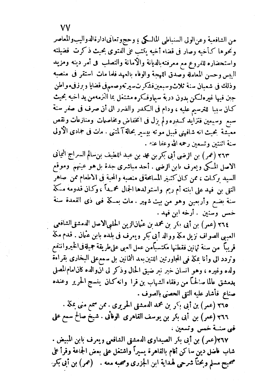 عمر بن أبي بكر بن مُحَمَّد بن عُثْمَان الزين الْحلَبِي الأَصْل الدِّمَشْقِي الشَّافِعِي العبيي الصَّواف نزيل مَكَّة ووالد أبي بكر وَيعرف فِي بَلَده بِابْن عُثْمَان. قدم مَكَّة قَرِيبا من سنة ثَمَانِينَ فقطنها مكتسبا من عمل العب على طَريقَة جميلَة فِي الْخَيْر وانتفع وَتردد إِلَيّ وَأَنا بِمَكَّة فِي المجاورتين اللَّتَيْنِ بعد الثَّمَانِينَ بل سمع عَليّ البُخَارِيّ بِقِرَاءَة وَلَده وَغَيره، وَهُوَ إِنْسَان خير نير ضيق الْحَال وَذكر لي أَن وَالِده كَانَ إِمَام الْمصلى بِدِمَشْق عَالما صَالحا من رُفَقَاء الشهَاب بل قَرَأَ وَأَنه كَانَ ينسج الْحَرِير وَعِنْده صناع فَأَشَارَ عَلَيْهِ التقي الحصني بالصوف.