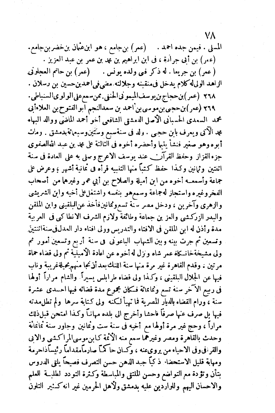 عمر بن حجي بن مُوسَى بن أَحْمد بن سعد النَّجْم أَبُو الْفتُوح بن الْعَلَاء أبي مُحَمَّد السَّعْدِيّ الحسباني الأَصْل الدِّمَشْقِي الشَّافِعِي أَخُو أَحْمد الْمَاضِي ووالد الْبَهَاء مُحَمَّد الْآتِي وَيعرف بِابْن حجي. ولد فِي سنة سبع وَسِتِّينَ وَسَبْعمائة بِدِمَشْق. وَمَات أَبوهُ وَهُوَ صَغِير فَنَشَأَ يَتِيما وأحضره أَخُوهُ فِي الثَّالِثَة على مُحَمَّد بن عبد الله الصفوي جُزْء الْقَزاز وَحفظ الْقُرْآن عِنْد يُوسُف الْأَعْرَج وَصلى بِهِ على الْعَادة فِي سنة اثْنَتَيْنِ وَثَمَانِينَ وَكَذَا حفظ كتبا مِنْهَا التَّنْبِيه قَرَأَهُ فِي ثَمَانِيَة أشهر وَعرض على جمَاعَة وأسمعه أَخُوهُ من ابْن أميلة وَالصَّلَاح بن أبي عمر وَغَيرهمَا من أَصْحَاب الْفَخر وَغَيره واستجاز لَهُ جمَاعَة وَسمع هُوَ بِنَفسِهِ واشتغل على أَخِيه وَابْن الشريشي وَآخَرين، وَدخل مصر سنة تسع وَثَمَانِينَ فَأخذ عَن البُلْقِينِيّ وَابْن الملقن والبدر الزَّرْكَشِيّ والعز بن جمَاعَة وَطَائِفَة ولازم الشّرف الْأَنْطَاكِي فِي الْعَرَبيَّة مُدَّة وَأذن لَهُ ابْن الملقن فِي)