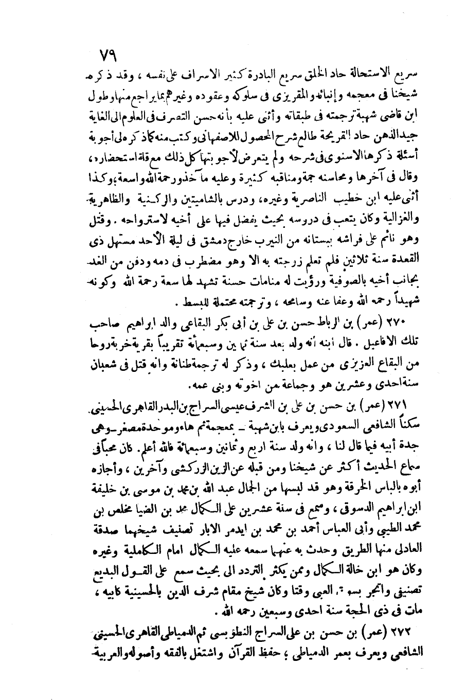 سريع الاستحالة حاد الْخلق سريع البادرة كثير الْإِسْرَاف على نَفسه، وَقد ذكره شَيخنَا فِي مُعْجَمه وإنبائه والمقريزي فِي سلوكه وعقوده وَغَيرهم بِمَا يُرَاجع مِنْهَا وَطول ابْن قَاضِي شُهْبَة تَرْجَمته فِي طبقاته وَأثْنى عَلَيْهِ بِأَحْسَن التَّصَرُّف فِي الْعُلُوم إِلَى الْغَايَة جيد الذِّهْن حاد القريحة طالع شرح الْمَحْصُول للأصفهاني وَكتب مِنْهُ كَمَا ذكره لي أجوبة أسئلة ذكرهَا الأسنوي فِي شَرحه وَلم يتَعَرَّض لأجوبتها كل ذَلِك مَعَ قلَّة استحضاره، وَقَالَ فِي آخرهَا: ومحاسنه جمة ومناقبه كَثِيرَة وَعَلِيهِ مآخذ وَرَحْمَة الله وَاسِعَة وَكَذَا أثنى عَلَيْهِ ابْن خطيب الناصرية وَغَيره، ودرس بالشاميتين والركنية والظاهرية والغزالية وَكَانَ يتعب فِي دروسه بِحَيْثُ يفضل فِيهَا على أَخِيه لاسترواحه. وَقتل وَهُوَ نَائِم على فرَاشه ببستانه من النيرب خَارج دمشق فِي لَيْلَة الْأَحَد مستهل ذِي الْقعدَة سنة ثَلَاثِينَ فَلم تعلم زَوجته بِهِ إِلَّا وَهُوَ مُضْطَرب فِي دَمه وَدفن من الْغَد بِجَانِب أَخِيه بالصوفية ورؤيت لَهُ منامات حَسَنَة تشهد لَهَا سَعَة رَحْمَة الله وَكَونه شَهِيدا رَحمَه الله وَعَفا عَنهُ وسامحه، وترجمته مُحْتَملَة للبسط.