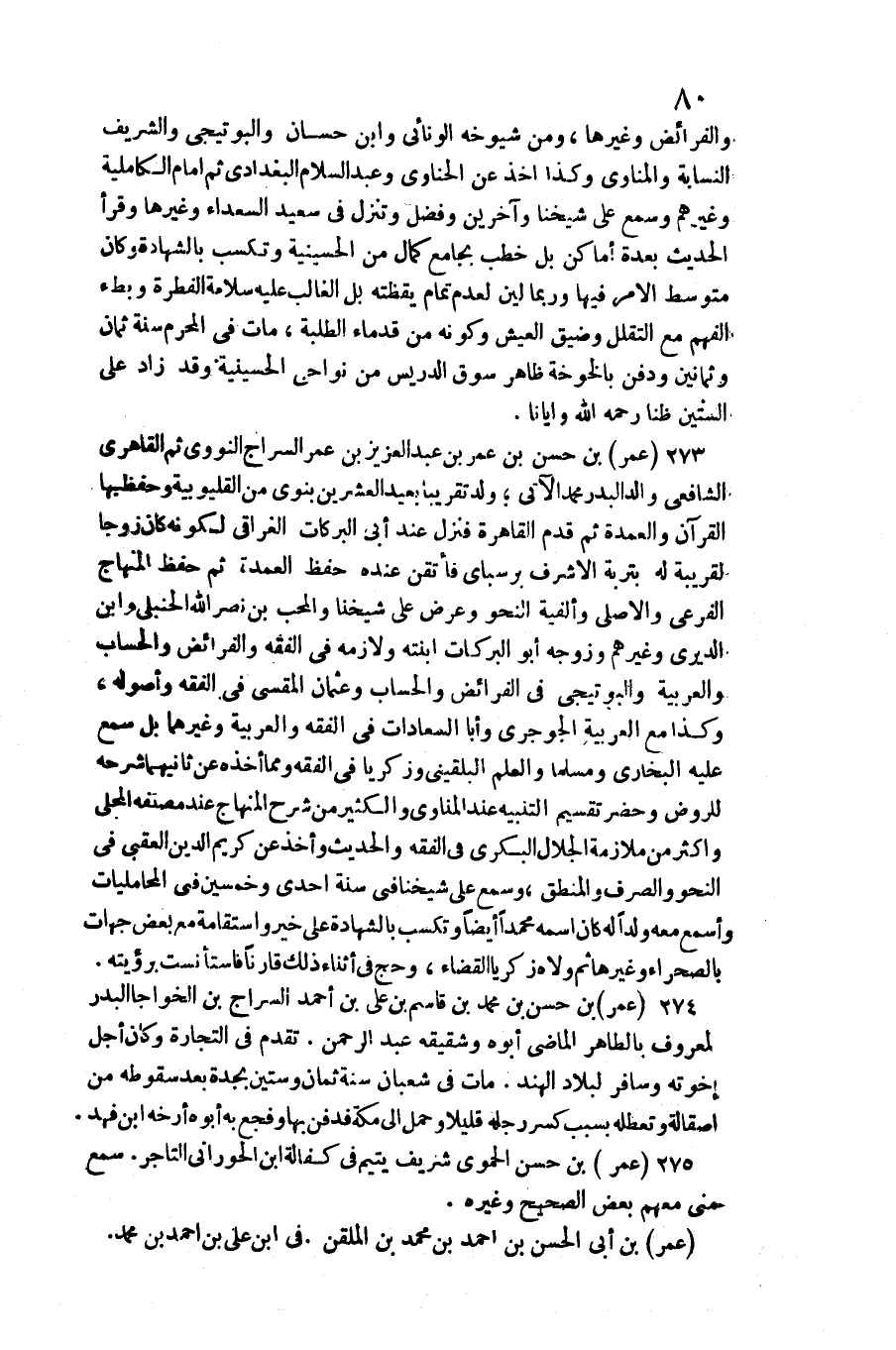 والفرائض وَغَيرهَا، وَمن شُيُوخه الونائي وَابْن حسان والبوتيجي والشريف النسابة والمناوي وَكَذَا أَخذ عَن الحناوي وَعبد السَّلَام الْبَغْدَادِيّ ثمَّ إِمَام الكاملية وَغَيرهم وَسمع على شَيخنَا وَآخَرين وَفضل وتنزل فِي سعيد السُّعَدَاء وَغَيرهَا وَقَرَأَ الحَدِيث بعدة أَمَاكِن بل خطب بِجَامِع كَمَال من الحسينية وتكسب بِالشَّهَادَةِ وَكَانَ متوسط الْأَمر فِيهَا وَرُبمَا لين لعدم تَمام يقظته بل الْغَالِب عَلَيْهِ سَلامَة الْفطْرَة وبطء الْفَهم مَعَ التقلل وضيق الْعَيْش وَكَونه من قدماء الطّلبَة، مَاتَ فِي الْمحرم سنة ثَمَان وَثَمَانِينَ وَدفن بالخوخة ظَاهر سوق الدريس من نواحي الحسينية وَقد زَاد على السِّتين ظنا رَحمَه اله وإيانا.