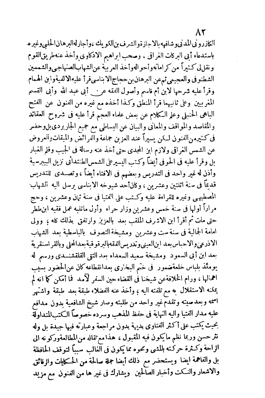 الكازروني الْمدنِي وشافهه بِالْإِجَازَةِ والشرف بن الكويك، وَأَجَازَ لَهُ الْبُرْهَان الْحلَبِي وَغَيره باستدعاء أبي البركات الغراقي، وَصَحب إِبْرَاهِيم الأدكاوي وَأخذ عَنهُ طَرِيق الْقَوْم وَنقل لي كثيرا من كراماته وأحواله وَأخذ الْعَرَبيَّة عَن الشهَاب الصنهاجي والشمسين الشطنوفي والعجمي ثمَّ عَن الْبُرْهَان بن حجاج الأبناسي قَرَأَ عَلَيْهِ الألفية وَابْن الْهمام وَقَرَأَ عَلَيْهِ شرحها لِابْنِ أم قَاسم وأصول الْفِقْه عَن أبي عبد الله وَأبي الْقسم المغربيين وعَلى ثَانِيهمَا قَرَأَ الْمنطق وَكَذَا أَخذه مَعَ غَيره من الْفُنُون عَن الْفَتْح الباهي الْحَنْبَلِيّ وَعلم الْكَلَام عَن بعض عُلَمَاء الْعَجم قَرَأَ عَلَيْهِ فِي شُرُوح العقائد والمقاصد والمواقف والمعاني وَالْبَيَان عَن الْبِسَاطِيّ مَعَ جَمِيع الجاربردي بل وَحضر فِي كثير من الْفُنُون لَكِن يَسِيرا عِنْد الْعِزّ بن جمَاعَة والفرائض والميقات وَالْعرُوض عَن الشَّمْس الغراقي ولازم ابْن المجدي حَتَّى أَخذ عَنهُ رِسَالَة فِي الجيب)