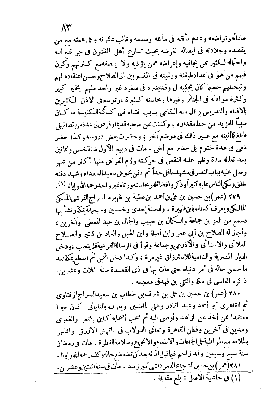 صفائه وتواضعه وَعدم تأنقه فِي مأكله وملبسه وغالب شئونه وهمته مَعَ من يَقْصِدهُ وجلادته فِي إيصاله لغرضه بِحَيْثُ تسارع أهل الظنون فِي جر نفع إِلَيْهِ واحتماله لكثير مِمَّن يجافيه وإعراضه عَمَّن يُؤْذِيه وَلَا ينصفه مَعَ كثرتهم وَكَون فيهم من هُوَ فِي عداد طبقته ورغبته فِي المنسوبين إِلَى الصّلاح وَحسن اعْتِقَاده لَهُم وتبجيلهم حَسْبَمَا كَانَ يحكيه لي وَقد بشره فِي صغره غير وَاحِد مِنْهُم بِخَير كَبِير وَكَثْرَة موافاته فِي الْجَنَائِز وَغَيرهَا ومحاسنه كَثِيرَة، وَتوسع فِي الْإِذْن لكثيرين بالإفتاء والتدريس ونال مِنْهُ البقاعي بِسَبَب فتياه فِي كائنة الْكَنِيسَة مَا كَانَ سَببا للمزيد من حط مِقْدَاره وَكنت مِمَّن صَحبه قَدِيما وقرض لي عدَّة من تصانيفي فأبلغ كَمَا أثْبته مَعَ غير ذَلِك فِي مَوضِع آخر وَحَضَرت بعض دروسه وَكَذَا حضر معي فِي عدَّة ختوم بل حضر مَعَ أخي. مَاتَ فِي ربيع)