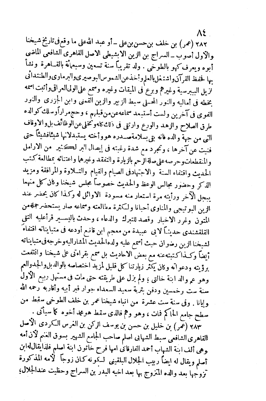 وتجرد مَعَ شدَّة رغبته فِي إِيصَال الْبر لكثير من الأرامل والمنقطعات وحرصه على صلَة الرَّحِم بالزيارة والتفقد وَغَيرهمَا واعتنائه بمطالعة كتب الحَدِيث واقتفاء السّنة وَالِاجْتِهَاد فِي الصّيام وَالْقِيَام والتلاوة والمرافقة ومزيد الذّكر وَحُضُور مجَالِس الْوَعْظ والْحَدِيث خُصُوصا مجْلِس شَيخنَا وَكَانَ كل مِنْهُمَا يبجل الآخر ورأيته مرّة اسْتعَار مِنْهُ مسودة الْأَوَائِل لَهُ وَكَذَا كَانَ يحضر عِنْد الزين البوتيجي والمناوي أَحْيَانًا ولكثرة مطالعته وسماعه صَار يستحضر جملَة من الْمُتُون وغرر الْأَخْبَار وَقصد للتبرك وَالدُّعَاء، وَحدث باليسير قَرَأَ عَلَيْهِ التقي القلقشندي حَدِيثا لأبي عُبَيْدَة من مُعْجم ابْن قَانِع أودعهُ فِي متبايناته اقتفاء لشَيْخِنَا الزين رضوَان حَيْثُ أسمع عَلَيْهِ وَلَده الحَدِيث الْمشَار إِلَيْهِ وخرجه فِي متبايناته أَيْضا وَكَذَا كتبته عَنهُ مَعَ بعض الْأَحَادِيث بل سمع بِقِرَاءَتِي على شَيخنَا وانتفعت بِرُؤْيَتِهِ ودعواته وَكَانَ يكثر زيارتنا كل قَلِيل لمزيد اخْتِصَاصه بالوالد بل وَالْجد وَالْعم وَهُوَ عَم وَالِد ابْنة خَالَتِي وَلم يزل على طَرِيقَته حَتَّى مَاتَ فِي مستهل ربيع الأول سنة سِتّ وَخمسين وَدفن بتربة سعيد السُّعَدَاء وَجوَار قبر أَبِيه وأقاربه رَحمَه الله وإيانا. وَفِي سنة سِتّ عشرَة من أنباء شَيخنَا عمر بن خلف الطوخي سقط من سطح جَامع الْحَاكِم فَمَاتَ، وَهُوَ وهم فَالَّذِي سقط هُوَ مُحَمَّد أَخُوهُ كَمَا سَيَأْتِي.