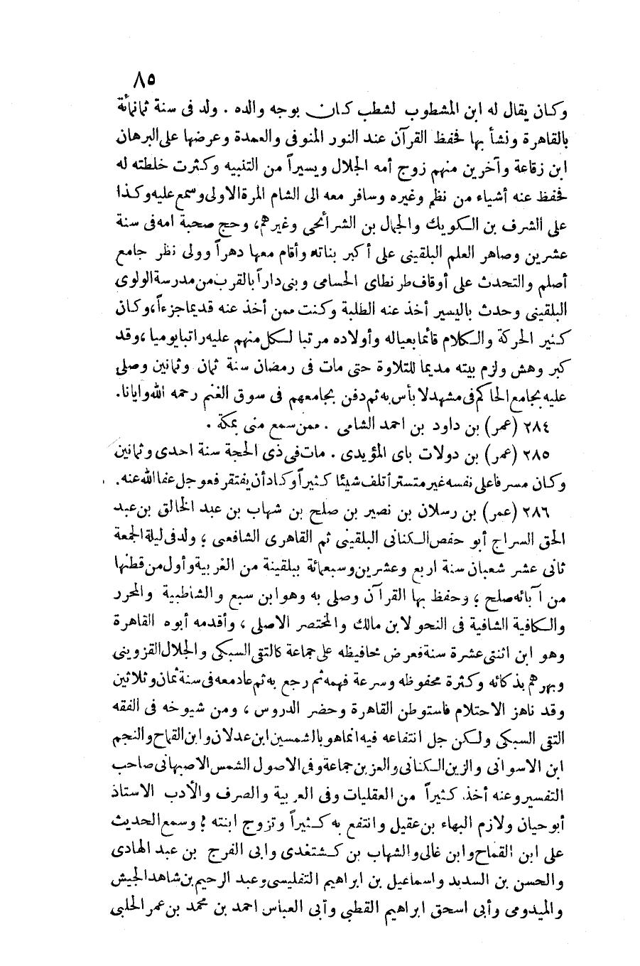 عمر بن رسْلَان بن نصير بن صلح بن شهَاب بن عبد الْخَالِق بن عبد الْحق السراج أَبُو حَفْص الْكِنَانِي البُلْقِينِيّ ثمَّ القاهري الشَّافِعِي ولد فِي لَيْلَة الْجُمُعَة ثَانِي عشر شعْبَان سنة أَربع وَعشْرين وَسَبْعمائة ببلقينة من الغربية وَأول من قطنها من آبَائِهِ صلح وَحفظ بهَا الْقُرْآن وَصلى بِهِ وَهُوَ ابْن سبع والشاطبية وَالْمُحَرر والكافية وَالشَّافِعِيَّة فِي النَّحْو لِابْنِ مَالك والمختصر الْأَصْلِيّ، وأقدمه أَبوهُ الْقَاهِرَة وَهُوَ ابْن اثْنَتَيْ عشرَة سنة فَعرض محافيظه على جمَاعَة كالتقي السُّبْكِيّ والجلال الْقزْوِينِي وبهرهم بذكائه وَكَثْرَة محفوظه وَسُرْعَة فهمه ثمَّ رَجَعَ بِهِ ثمَّ عَاد مَعَه سنة ثَمَان وَثَلَاثِينَ وَقد ناهز الِاحْتِلَام فاستوطن الْقَاهِرَة وَحضر الدُّرُوس، وَمن شُيُوخه فِي الْفِقْه التقي السُّبْكِيّ وَلَكِن جلّ انتفاعه فِيهِ إِنَّمَا هُوَ بالشمسين ابْن عَدْلَانِ وَابْن القماح والنجم ابْن الأسواني والزين الْكِنَانِي والعز بن جمَاعَة وَفِي الْأُصُول الشَّمْس الْأَصْبَهَانِيّ صَاحب التَّفْسِير وَعنهُ أَخذ كثيرا من العقليات وَفِي الْعَرَبيَّة وَالصرْف وَالْأَدب الْأُسْتَاذ أَبُو حَيَّان ولازم الْبَهَاء بن عقيل وانتفع بِهِ كثيرا وَتزَوج ابْنَته وَسمع الحَدِيث على ابْن القماح وَابْن غالي والشهاب بن كشتغدي وَأبي الْفرج بن عبد الْهَادِي وَالْحسن بن السديد وَإِسْمَاعِيل بن إِبْرَاهِيم التفليسي وَعبد الرَّحِيم بن شَاهد الْجَيْش وَالْحسن بن السديد وَإِسْمَاعِيل بن إِبْرَاهِيم التفليسي وَعبد الرَّحِيم بن شَاهد الْجَيْش والميدومي وَأبي إِسْحَق إِبْرَاهِيم القطبي وَأبي الْعَبَّاس أَحْمد بن مُحَمَّد بن عمر الْحلَبِي