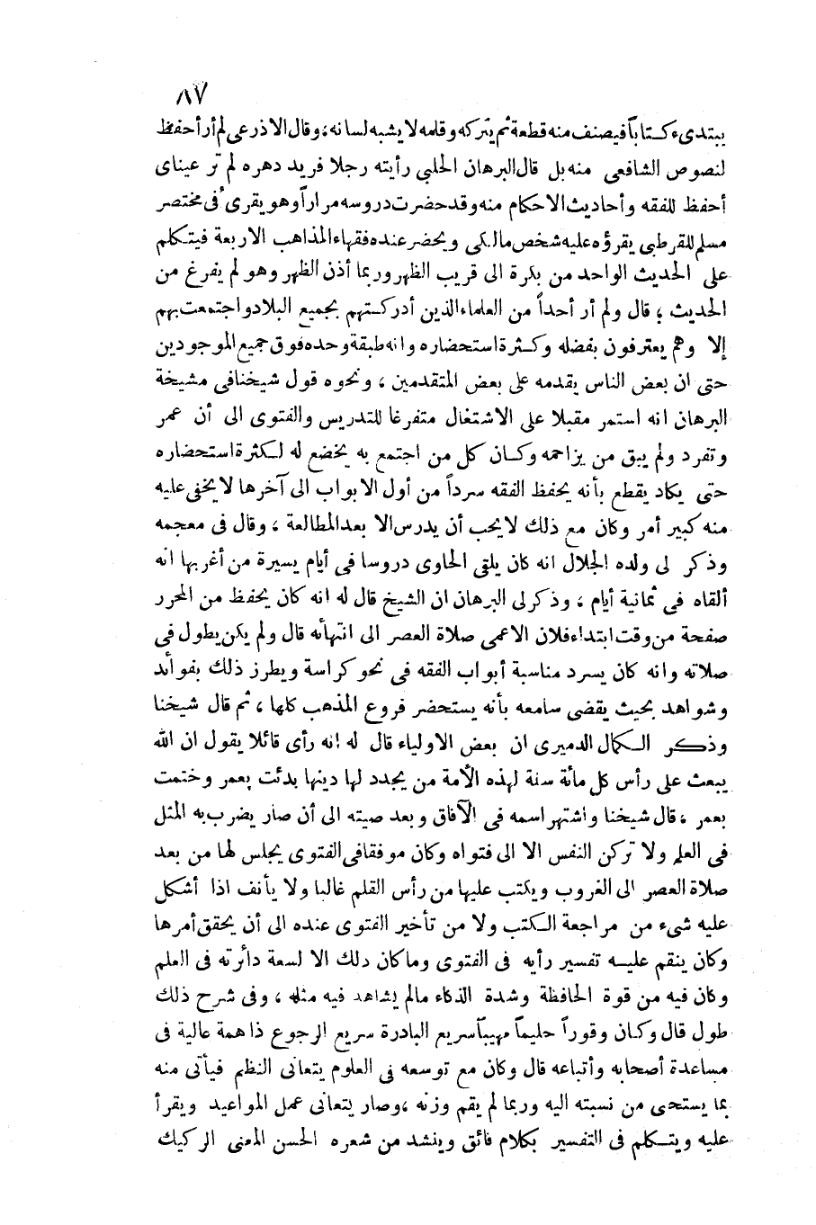 لم أر أحفظ لنصوص الشَّافِعِي مِنْهُ بل قَالَ الْبُرْهَان الْحلَبِي: رَأَيْته رجلا فريد دهره لم تَرَ عَيْنَايَ أحفظ للفقه وَأَحَادِيث الْأَحْكَام مِنْهُ وَقد حضرت دروسه مرَارًا وَهُوَ يقرئ فِي مُخْتَصر مُسلم للقرطبي يَقْرَؤُهُ عَلَيْهِ شخص مالكي ويحضر عِنْده فُقَهَاء الْمذَاهب الْأَرْبَعَة فيتكلم على الحَدِيث الْوَاحِد من بكرَة إِلَى قريب الظّهْر وَرُبمَا أذن الظّهْر وَهُوَ لم يفرغ من الحَدِيث قَالَ: وَلم أر أحدا من الْعلمَاء الَّذين أدركتهم بِجَمِيعِ الْبِلَاد وَاجْتمعت بهم إِلَّا وهم يعترفون بفضله وَكَثْرَة استحضاره وَأَنه طبقَة وَحده فَوق جَمِيع الْمَوْجُودين حَتَّى أَن بعض النَّاس يقدمهُ على بعض الْمُتَقَدِّمين، وَنَحْوه قَول شَيخنَا فِي مشيخة الْبُرْهَان أَنه اسْتمرّ مُقبلا على الِاشْتِغَال متفرغا للتدريس وَالْفَتْوَى إِلَى أَن عمر وَتفرد وَلم يبْق من يزاحمه وَكَانَ كل من اجْتمع بِهِ يخضع لَهُ لِكَثْرَة استحضاره حَتَّى يكَاد يقطع بِأَنَّهُ يحفظ الْفِقْه سردا من أول الْأَبْوَاب إِلَى آخرهَا لَا يخفى عَلَيْهِ مِنْهُ كَبِير أَمر وَكَانَ مَعَ ذَلِك لَا يحب أَن يدرس إِلَّا بعد المطالعة، وَقَالَ فِي مُعْجَمه: وَذكر لي وَلَده الْجلَال أَنه كَانَ يلقى الْحَاوِي دروسا فِي أَيَّام يسيرَة من أغربها أَنه أَلْقَاهُ فِي ثَمَانِيَة أَيَّام، وَذكر لي الْبُرْهَان أَن الشَّيْخ قَالَ لَهُ أَنه كَانَ يحفظ من الْمُحَرر صفحة من وَقت ابْتِدَاء فلَان الْأَعْمَى صَلَاة الْعَصْر إِلَى انتهائه قَالَ: وَلم يكن يطول فِي صلَاته وَأَنه كَانَ يسْرد مُنَاسبَة أَبْوَاب الْفِقْه فِي نَحْو كراسة ويطرز ذَلِك بفوائد وشواهد بِحَيْثُ يقْضِي سامعه بِأَنَّهُ يستحضر فروع الْمَذْهَب كلهَا، ثمَّ قَالَ شَيخنَا: وَذكر الْكَمَال الدَّمِيرِيّ أَن بعض الْأَوْلِيَاء قَالَ لَهُ أَنه رأى قَائِلا يَقُول أَن الله يبْعَث على رَأس كل مائَة سنة لهَذِهِ الْأمة من يجدد لَهَا دينهَا بدئت بعمر وختمت بعمر، قَالَ شَيخنَا: واشتهر اسْمه فِي الْآفَاق وَبعد صيته إِلَى أَن صَار يضْرب بِهِ الْمثل فِي الْعلم وَلَا تركن النَّفس إِلَّا إِلَى فتواه وَكَانَ موفقا فِي الْفَتْوَى يجلس لَهَا من بعد صَلَاة الْعَصْر إِلَى الْغُرُوب وَيكْتب عَلَيْهَا من رَأس الْقَلَم غَالِبا وَلَا يأنف إِذا أشكل عَلَيْهِ شَيْء من مُرَاجعَة الْكتب وَلَا من تَأْخِير الْفَتْوَى عِنْده إِلَى أَن يُحَقّق أمرهَا وَكَانَ ينقم عَلَيْهِ تَفْسِير رَأْيه فِي الْفَتْوَى وَمَا كَانَ ذَلِك إِلَّا لسعة دائرته فِي الْعلم وَكَانَ فِيهِ من الْقُوَّة الحافظة وَشدَّة الذكاء مَا لم يُشَاهد فِيهِ مثله، وَفِي شرح ذَلِك طول قَالَ: وَكَانَ وقورا حَلِيمًا مهيبا سريع البادرة سريع الرُّجُوع ذَا همة عالية فِي مساعدة أَصْحَابه)