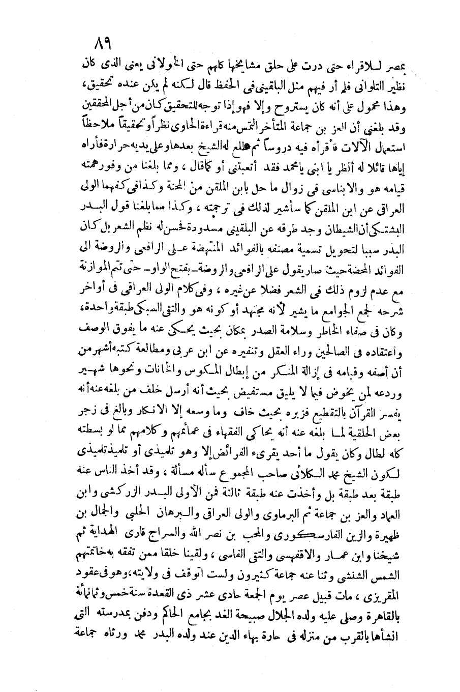 بِمصْر للإقراء حَتَّى درت على حلق مشايخها كلهم حَتَّى الْخَولَانِيّ يَعْنِي الَّذِي كَانَ نَظِير التلواني فَلم أر فيهم مثل البُلْقِينِيّ فِي الْحِفْظ قَالَ: لكنه لم يكن عِنْده تَحْقِيق، وَهَذَا مَحْمُول على أَنه كَانَ يستروح وَإِلَّا فَهُوَ إِذا توجه للتحقيق كَانَ من أجل الْمُحَقِّقين وَقد بَلغنِي أَن الْعِزّ بن جمَاعَة الْمُتَأَخر التمس مِنْهُ قِرَاءَة الْحَاوِي نظرا وتحقيقا ملاحظا اسْتِعْمَال الْآلَات فَأَقْرَأهُ فِيهِ دروسا ثمَّ طلع لَهُ الشَّيْخ بعْدهَا وعَلى يَدَيْهِ حرارة فَأرَاهُ إِيَّاهَا قَائِلا لَهُ: انْظُر يَا ابْني يَا مُحَمَّد فقد أتعبتني أَو كَمَا قَالَ، وَمِمَّا بَلغنِي من وفور همته قِيَامه هُوَ والأبناسي فِي زَوَال مَا حل بِابْن الملقن من المحنة وَكَذَا فِي كفهما الْوَلِيّ الْعِرَاقِيّ عَن ابْن الملقن كَمَا سأشير لذَلِك فِي تَرْجَمته، وَكَذَا مِمَّا بلغنَا قَول الْبَدْر البشتكي أَن الشَّيْطَان وجد طرقه عَن البُلْقِينِيّ مسدودة فَحسن لَهُ نظم الشّعْر بل كَانَ الْبَدْر سَببا لتحويل تَسْمِيَة مُصَنفه بالفوائد المنتهضة على الرَّافِعِيّ وَالرَّوْضَة إِلَى الْفَوَائِد الْمَحْضَة حَيْثُ صَار يَقُول على الرَّافِعِيّ وَالرَّوْضَة بِفَتْح الْوَاو حَتَّى تتمّ الموازنة مَعَ عدم لُزُوم ذَلِك فِي الشّعْر فضلا عَن غَيره، وَفِي كَلَام الْوَلِيّ الْعِرَاقِيّ فِي أَوَاخِر شَرحه لجوامع مَا يُشِير لِأَنَّهُ مُجْتَهد أَو كَونه هُوَ والتقي السُّبْكِيّ طبقَة وَاحِدَة، وَكَانَ فِي صفاء الخاطر وسلامة الصَّدْر بمَكَان بِحَيْثُ يحْكى عَنهُ مَا يفوق الْوَصْف واعتقاده فِي الصَّالِحين وَرَاء الْعقل وتنفيره عَن ابْن عَرَبِيّ ومطالعة كتبه أشهر من أَن أصفه وقيامه فِي إِزَالَة الْمُنكر من إبِْطَال المكوس والخانات وَنَحْوهَا شهير وردعه لمن يَخُوض فِيمَا لَا يَلِيق مستفيض بِحَيْثُ أَنه أرسل خلف من بلغه عَنهُ أَنه يُفَسر الْقُرْآن بالتقطيع فزبره)