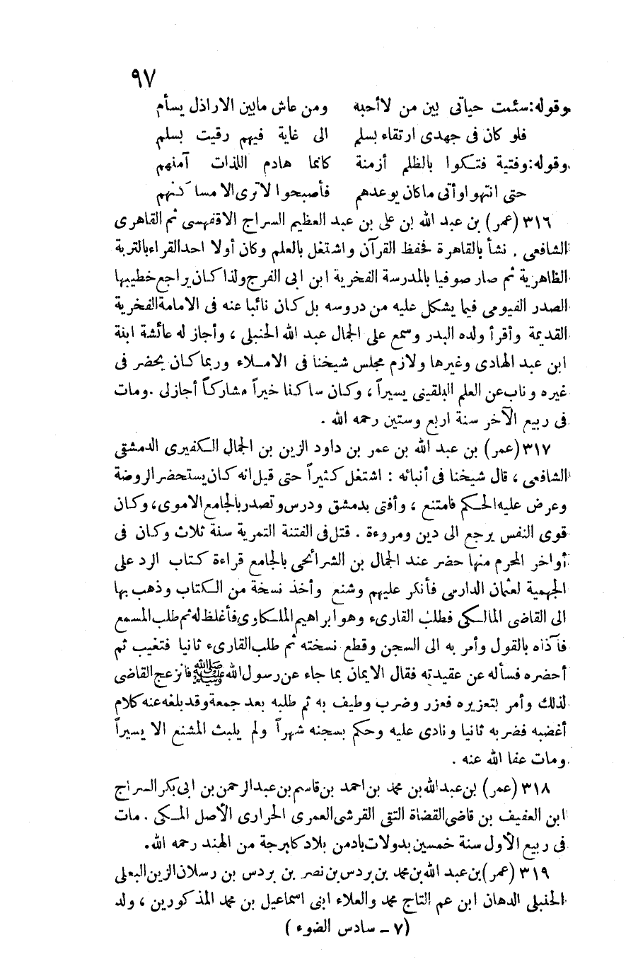 عمر بن عبد الله بن عمر بن دَاوُد الزين بن الْجمال الكفيري الدِّمَشْقِي الشَّافِعِي، قَالَ شَيخنَا فِي أنبائه: اشْتغل كثيرا حَتَّى قيل أَنه كَانَ يستحضر الرَّوْضَة وَعرض عَلَيْهِ الحكم فَامْتنعَ، وَأفْتى بِدِمَشْق ودرس وتصدر بالجامع الْأمَوِي، وَكَانَ قوي النَّفس يرجع إِلَى دين ومروءة. قتل فِي الْفِتْنَة التمرية سنة ثَلَاث وَكَانَ فِي أَوَاخِر الْمحرم مِنْهَا حضر عِنْد الْجمال بن الشرائحي بالجامع قِرَاءَة كتاب الرَّد على الْجَهْمِية لعُثْمَان الدِّرَامِي فَأنْكر عَلَيْهِم وشنع وَأخذ نُسْخَة من الْكتاب وَذهب بهَا إِلَى القَاضِي الْمَالِكِي فَطلب الْقَارئ وَهُوَ إِبْرَاهِيم الملكاوي فَأَغْلَظ لَهُ ثمَّ طلب المسمع فآذاه بالْقَوْل وَأمر بِهِ فِي السجْن وَقطع نسخته ثمَّ طلب الْقَارئ ثَانِيًا فتغيب ثمَّ أحضرهُ فَسَأَلَهُ عَن عقيدته فَقَالَ: الْإِيمَان بِمَا جَاءَ عَن رَسُول الله صلى الله عَلَيْهِ وَسلم فانزعج القَاضِي لذَلِك وَأمر بتعزيره فعزر وَضرب وطيف بِهِ ثمَّ طلبه بعد جُمُعَة وَقد بلغه عَنهُ كَلَام أغضبهُ فَضَربهُ ثَانِيًا ونادى عَلَيْهِ وَحكم بسجنه شهرا وَلم يلبث المشنع إِلَّا يَسِيرا وَمَات عَفا الله عَنهُ.
