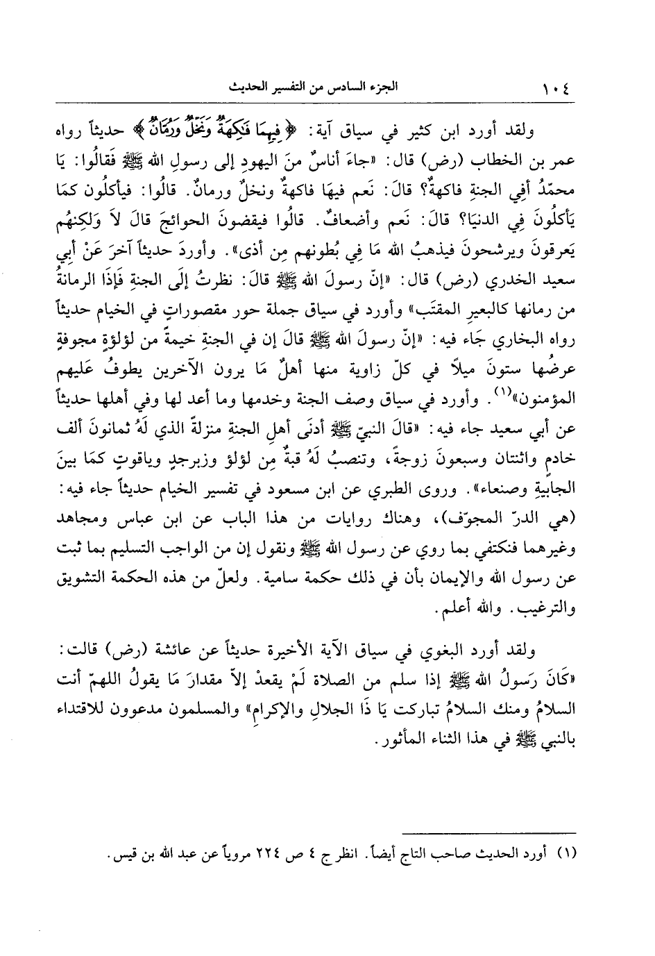 ولقد أورد ابن كثير في سياق آية: فِيهِما فاكِهَةٌ وَنَخْلٌ وَرُمَّانٌ حديثا رواه عمر بن الخطاب (رض) قال: «جاء أناس من اليهود إلى رسول الله صلّى الله عليه وسلّم فقالوا: يا محمّد أفي الجنة فاكهة؟ قال: نعم فيها فاكهة ونخل ورمان. قالوا: فيأكلون كما يأكلون في الدنيا؟ قال: نعم وأضعاف. قالوا فيقضون الحوائج قال لا ولكنهم يعرقون ويرشحون فيذهب الله ما في بطونهم من أذى» . وأورد حديثا آخر عن أبي سعيد الخدري (رض) قال: «إنّ رسول الله صلّى الله عليه وسلّم قال: نظرت إلى الجنة فإذا الرمانة من رمانها كالبعير المقتب» وأورد في سياق جملة حور مقصورات في الخيام حديثا رواه البخاري جاء فيه: «إنّ رسول الله صلّى الله عليه وسلّم قال إن في الجنة خيمة من لؤلؤة مجوفة عرضها ستون ميلا في كلّ زاوية منها أهل ما يرون الآخرين يطوف عليهم المؤمنون» «1» . وأورد في سياق وصف الجنة وخدمها وما أعد لها وفي أهلها حديثا عن أبي سعيد جاء فيه: «قال النبيّ صلّى الله عليه وسلّم أدنى أهل الجنة منزلة الذي له ثمانون ألف خادم واثنتان وسبعون زوجة، وتنصب له قبة من لؤلؤ وزبرجد وياقوت كما بين الجابية وصنعاء» . وروى الطبري عن ابن مسعود في تفسير الخيام حديثا جاء فيه: