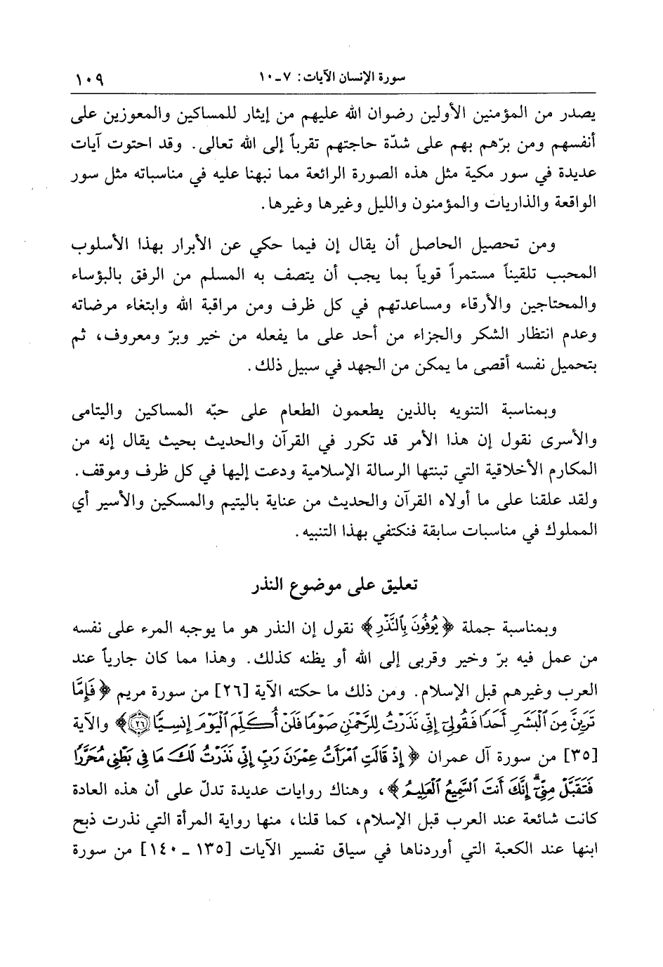 وبمناسبة جملة يُوفُونَ بِالنَّذْرِ نقول إن النذر هو ما يوجبه المرء على نفسه من عمل فيه برّ وخير وقربى إلى الله أو يظنه كذلك. وهذا مما كان جاريا عند العرب وغيرهم قبل الإسلام. ومن ذلك ما حكته الآية [26] من سورة مريم فَإِمَّا تَرَيِنَّ مِنَ الْبَشَرِ أَحَداً فَقُولِي إِنِّي نَذَرْتُ لِلرَّحْمنِ صَوْماً فَلَنْ أُكَلِّمَ الْيَوْمَ إِنْسِيًّا (26) والآية [35] من سورة آل عمران إِذْ قالَتِ امْرَأَتُ عِمْرانَ رَبِّ إِنِّي نَذَرْتُ لَكَ ما فِي بَطْنِي مُحَرَّراً فَتَقَبَّلْ مِنِّي إِنَّكَ أَنْتَ السَّمِيعُ الْعَلِيمُ، وهناك روايات عديدة تدلّ على أن هذه العادة كانت شائعة عند العرب قبل الإسلام، كما قلنا، منها رواية المرأة التي نذرت ذبح ابنها عند الكعبة التي أوردناها في سياق تفسير الآيات [135- 140] من سورة