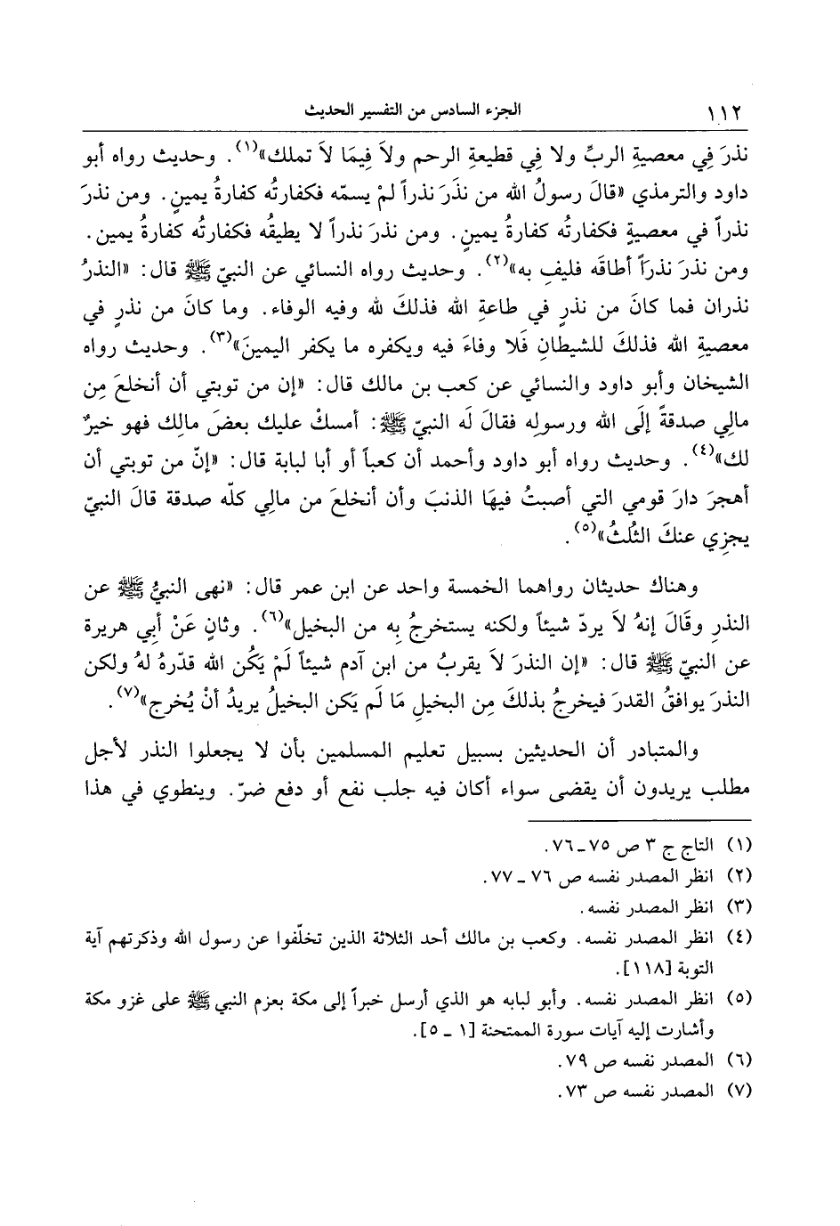 وهناك حديثان رواهما الخمسة واحد عن ابن عمر قال: «نهى النبيّ صلّى الله عليه وسلّم عن النذر وقال إنه لا يردّ شيئا ولكنه يستخرج به من البخيل» «6» وثان عن أبي هريرة عن النبيّ صلّى الله عليه وسلّم قال: «إن النذر لا يقرب من ابن آدم شيئا لم يكن الله قدّره له ولكن النذر يوافق القدر فيخرج بذلك من البخيل ما لم يكن البخيل يريد أن يخرج» «7» .