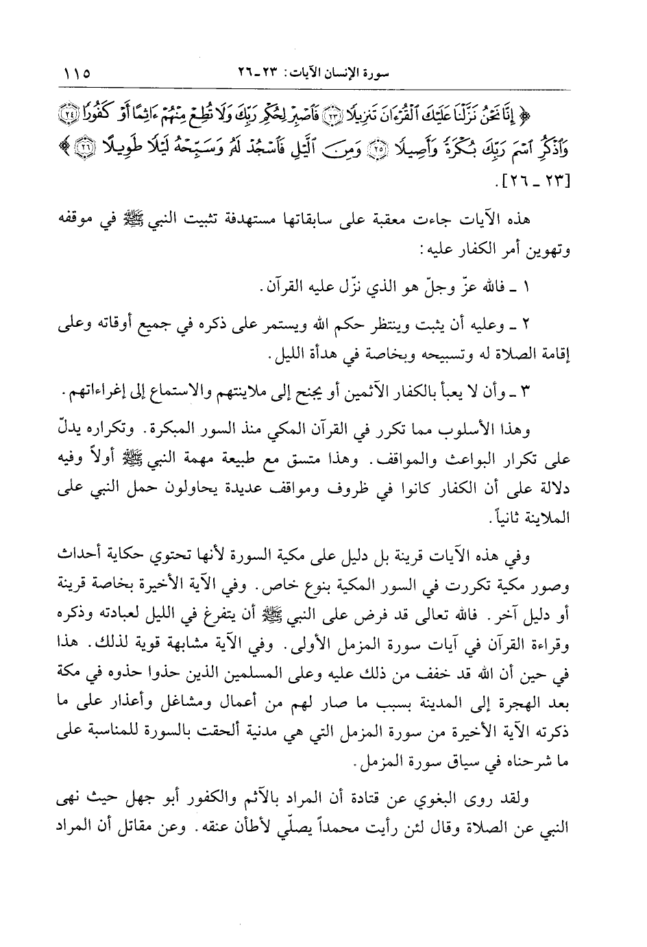 إِنَّا نَحْنُ نَزَّلْنا عَلَيْكَ الْقُرْآنَ تَنْزِيلاً (23) فَاصْبِرْ لِحُكْمِ رَبِّكَ وَلا تُطِعْ مِنْهُمْ آثِماً أَوْ كَفُوراً (24) وَاذْكُرِ اسْمَ رَبِّكَ بُكْرَةً وَأَصِيلاً (25) وَمِنَ اللَّيْلِ فَاسْجُدْ لَهُ وَسَبِّحْهُ لَيْلاً طَوِيلاً (26)