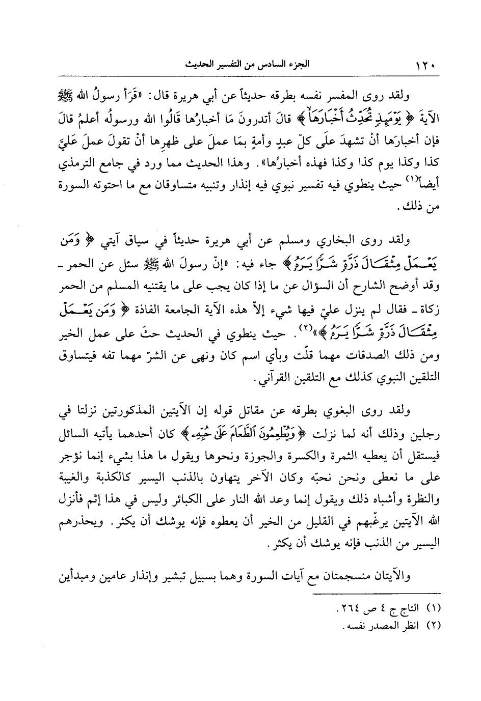 ولقد روى المفسر نفسه بطرقه حديثا عن أبي هريرة قال: «قرأ رسول الله صلّى الله عليه وسلّم الآية يَوْمَئِذٍ تُحَدِّثُ أَخْبارَها قال أتدرون ما أخبارها قالوا الله ورسوله أعلم قال فإن أخبارها أن تشهد على كلّ عبد وأمة بما عمل على ظهرها أن تقول عمل عليّ كذا وكذا يوم كذا وكذا فهذه أخبارها» . وهذا الحديث مما ورد في جامع الترمذي أيضا «1» حيث ينطوي فيه تفسير نبوي فيه إنذار وتنبيه متساوقان مع ما احتوته السورة من ذلك.