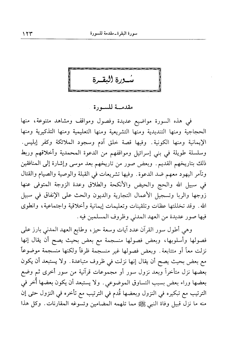 وهي أطول سور القرآن عدد آيات وسعة حيز، وطابع العهد المدني بارز على فصولها وأسلوبها، وبعض فصولها منسجمة مع بعض بحيث يصح أن يقال إنها نزلت معا أو متتابعة. وبعض فصولها غير منسجمة ظرفا ولكنها منسجمة موضوعا مع بعض بحيث يصح أن يقال إنها نزلت في ظروف متباعدة. ولا يستبعد أن يكون بعضها نزل متأخرا وبعد نزول سور أو مجموعات قرآنية من سور أخرى ثم وضع بعضها وراء بعض بسبب التساوق الموضوعي. ولا يستبعد أن يكون بعضها أخر في الترتيب مع تبكيره في النزول وبعضها قدم في الترتيب مع تأخره في النزول حتى إن منه ما نزل قبيل وفاة النبي صلّى الله عليه وسلّم مما تلهمه المضامين وتسوغه المقارنات. وكل هذا
