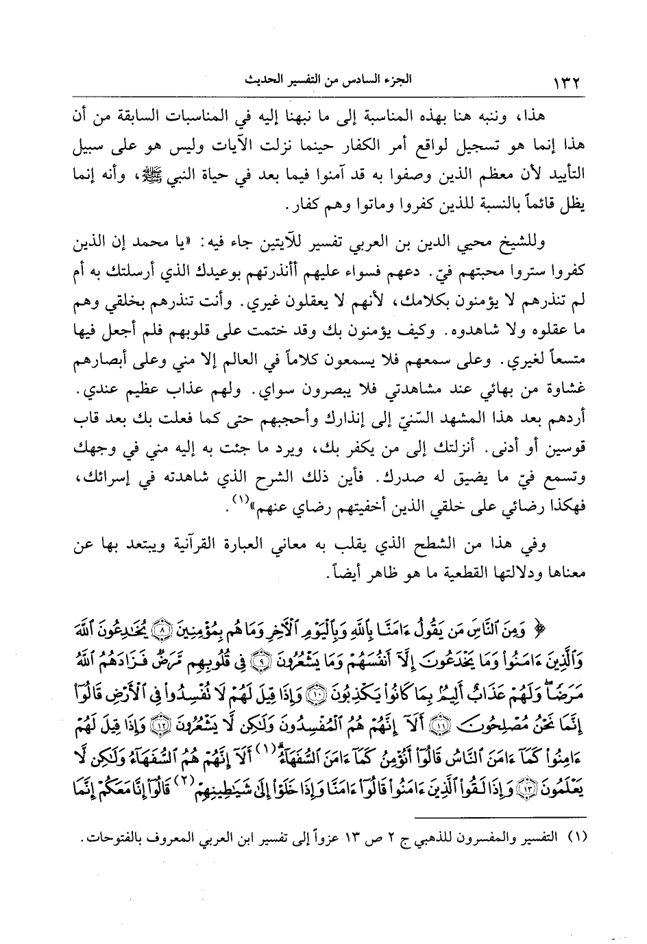 وللشيخ محيي الدين بن العربي تفسير للآيتين جاء فيه: «يا محمد إن الذين كفروا ستروا محبتهم فيّ. دعهم فسواء عليهم أأنذرتهم بوعيدك الذي أرسلتك به أم لم تنذرهم لا يؤمنون بكلامك، لأنهم لا يعقلون غيري. وأنت تنذرهم بخلقي وهم ما عقلوه ولا شاهدوه. وكيف يؤمنون بك وقد ختمت على قلوبهم فلم أجعل فيها متسعا لغيري. وعلى سمعهم فلا يسمعون كلاما في العالم إلا مني وعلى أبصارهم غشاوة من بهائي عند مشاهدتي فلا يبصرون سواي. ولهم عذاب عظيم عندي.