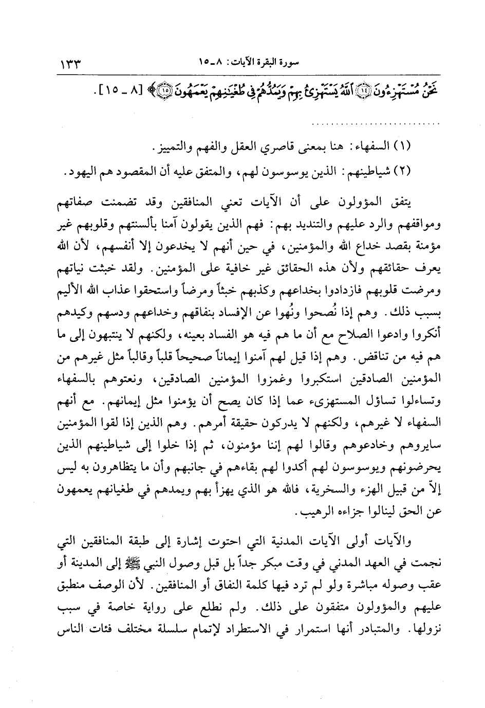 يتفق المؤولون على أن الآيات تعني المنافقين وقد تضمنت صفاتهم ومواقفهم والرد عليهم والتنديد بهم: فهم الذين يقولون آمنا بألسنتهم وقلوبهم غير مؤمنة بقصد خداع الله والمؤمنين، في حين أنهم لا يخدعون إلا أنفسهم، لأن الله يعرف حقائقهم ولأن هذه الحقائق غير خافية على المؤمنين. ولقد خبثت نياتهم ومرضت قلوبهم فازدادوا بخداعهم وكذبهم خبثا ومرضا واستحقوا عذاب الله الأليم بسبب ذلك. وهم إذا نصحوا ونهوا عن الإفساد بنفاقهم وخداعهم ودسهم وكيدهم أنكروا وادعوا الصلاح مع أن ما هم فيه هو الفساد بعينه، ولكنهم لا ينتبهون إلى ما هم فيه من تناقض. وهم إذا قيل لهم آمنوا إيمانا صحيحا قلبا وقالبا مثل غيرهم من المؤمنين الصادقين استكبروا وغمزوا المؤمنين الصادقين، ونعتوهم بالسفهاء وتساءلوا تساؤل المستهزئ عما إذا كان يصح أن يؤمنوا مثل إيمانهم. مع أنهم السفهاء لا غيرهم، ولكنهم لا يدركون حقيقة أمرهم. وهم الذين إذا لقوا المؤمنين سايروهم وخادعوهم وقالوا لهم إننا مؤمنون، ثم إذا خلوا إلى شياطينهم الذين يحرضونهم ويوسوسون لهم أكدوا لهم بقاءهم في جانبهم وأن ما يتظاهرون به ليس إلّا من قبيل الهزء والسخرية، فالله هو الذي يهزأ بهم ويمدهم في طغيانهم يعمهون عن الحق لينالوا جزاءه الرهيب.