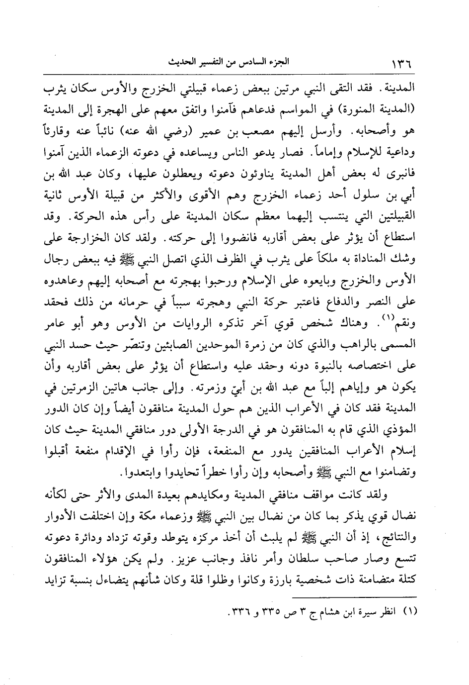 المدينة. فقد التقى النبي مرتين ببعض زعماء قبيلتي الخزرج والأوس سكان يثرب (المدينة المنورة) في المواسم فدعاهم فآمنوا واتفق معهم على الهجرة إلى المدينة هو وأصحابه. وأرسل إليهم مصعب بن عمير (رضي الله عنه) نائبا عنه وقارئا وداعية للإسلام وإماما. فصار يدعو الناس ويساعده في دعوته الزعماء الذين آمنوا فانبرى له بعض أهل المدينة يناوئون دعوته ويعطلون عليها، وكان عبد الله بن أبي بن سلول أحد زعماء الخزرج وهم الأقوى والأكثر من قبيلة الأوس ثانية القبيلتين التي ينتسب إليهما معظم سكان المدينة على رأس هذه الحركة. وقد استطاع أن يؤثر على بعض أقاربه فانضووا إلى حركته. ولقد كان الخزارجة على وشك المناداة به ملكا على يثرب في الظرف الذي اتصل النبي صلّى الله عليه وسلّم فيه ببعض رجال الأوس والخزرج وبايعوه على الإسلام ورحبوا بهجرته مع أصحابه إليهم وعاهدوه على النصر والدفاع فاعتبر حركة النبي وهجرته سببا في حرمانه من ذلك فحقد ونقم «1» . وهناك شخص قوي آخر تذكره الروايات من الأوس وهو أبو عامر المسمى بالراهب والذي كان من زمرة الموحدين الصابئين وتنصّر حيث حسد النبي على اختصاصه بالنبوة دونه وحقد عليه واستطاع أن يؤثر على بعض أقاربه وأن يكون هو وإياهم إلبا مع عبد الله بن أبيّ وزمرته. وإلى جانب هاتين الزمرتين في المدينة فقد كان في الأعراب الذين هم حول المدينة منافقون أيضا وإن كان الدور المؤذي الذي قام به المنافقون هو في الدرجة الأولى دور منافقي المدينة حيث كان إسلام الأعراب المنافقين يدور مع المنفعة، فإن رأوا في الإقدام منفعة أقبلوا وتضامنوا مع النبي صلّى الله عليه وسلّم وأصحابه وإن رأوا خطرا تحايدوا وابتعدوا.