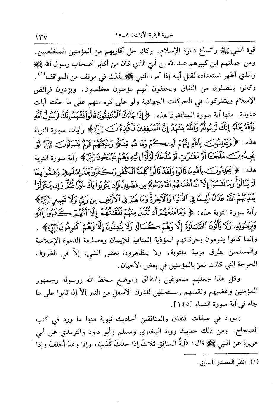 ويورد في صفات النفاق والمنافقين أحاديث نبوية منها ما ورد في كتب الصحاح. ومن ذلك حديث رواه البخاري ومسلم وأبو داود والترمذي عن أبي هريرة عن النبي صلّى الله عليه وسلّم قال: «آية المنافق ثلاث إذا حدّث كذب، وإذا وعد أخلف وإذا