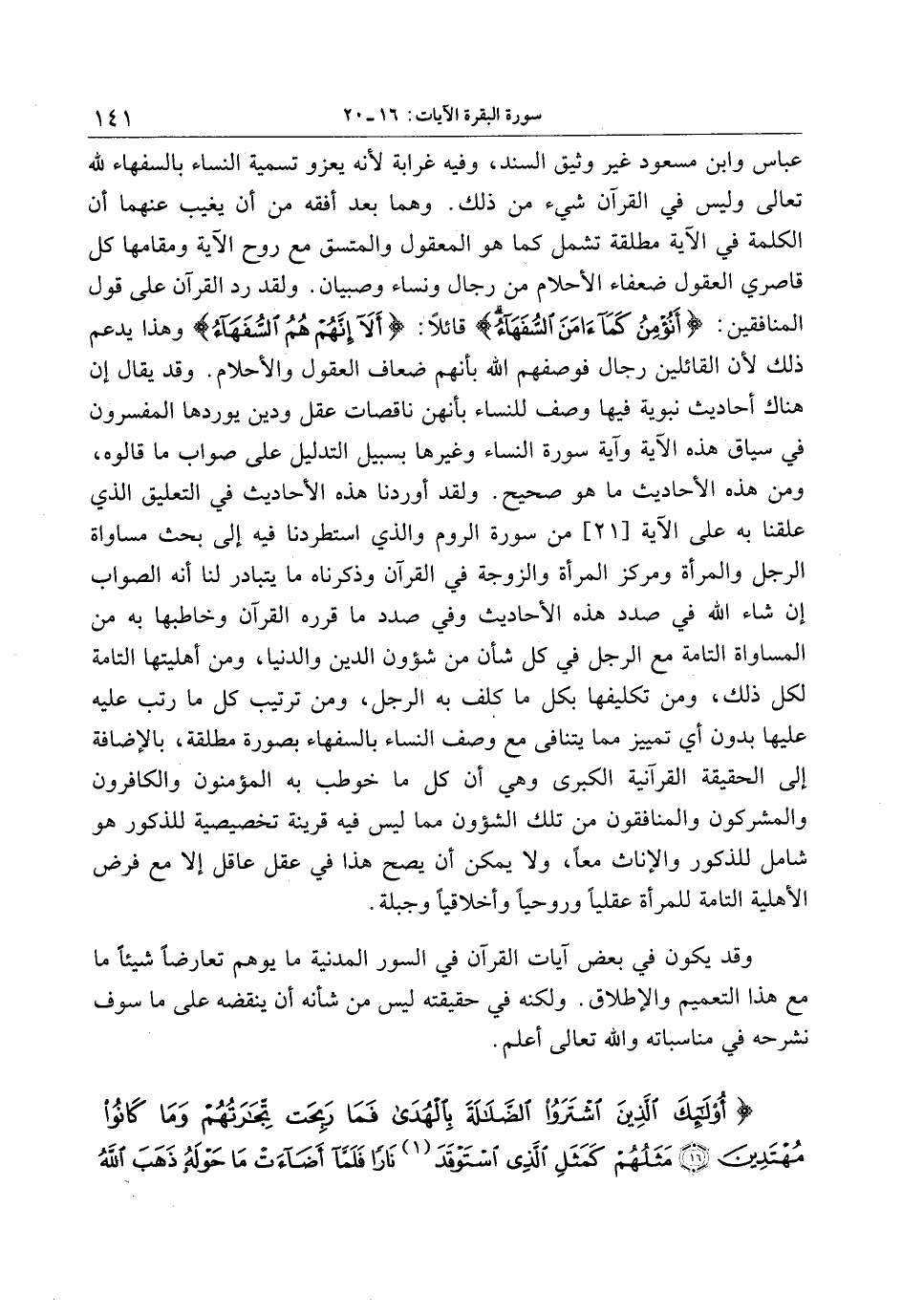 عباس وابن مسعود غير وثيق السند، وفيه غرابة لأنه يعزو تسمية النساء بالسفهاء لله تعالى وليس في القرآن شيء من ذلك. وهما بعد أفقه من أن يغيب عنهما أن الكلمة في الآية مطلقة تشمل كما هو المعقول والمتسق مع روح الآية ومقامها كل قاصري العقول ضعفاء الأحلام من رجال ونساء وصبيان. ولقد رد القرآن على قول المنافقين: أَنُؤْمِنُ كَما آمَنَ السُّفَهاءُ قائلا: أَلا إِنَّهُمْ هُمُ السُّفَهاءُ وهذا يدعم ذلك لأن القائلين رجال فوصفهم الله بأنهم ضعاف العقول والأحلام. وقد يقال إن هناك أحاديث نبوية فيها وصف للنساء بأنهن ناقصات عقل ودين يوردها المفسرون في سياق هذه الآية وآية سورة النساء وغيرها بسبيل التدليل على صواب ما قالوه، ومن هذه الأحاديث ما هو صحيح. ولقد أوردنا هذه الأحاديث في التعليق الذي علقنا به على الآية [21] من سورة الروم والذي استطردنا فيه إلى بحث مساواة الرجل والمرأة ومركز المرأة والزوجة في القرآن وذكرناه ما يتبادر لنا أنه الصواب إن شاء الله في صدد هذه الأحاديث وفي صدد ما قرره القرآن وخاطبها به من المساواة التامة مع الرجل في كل شأن من شؤون الدين والدنيا، ومن أهليتها التامة لكل ذلك، ومن تكليفها بكل ما كلف به الرجل، ومن ترتيب كل ما رتب عليه عليها بدون أي تمييز مما يتنافى مع وصف النساء بالسفهاء بصورة مطلقة، بالإضافة إلى الحقيقة القرآنية الكبرى وهي أن كل ما خوطب به المؤمنون والكافرون والمشركون والمنافقون من تلك الشؤون مما ليس فيه قرينة تخصيصية للذكور هو شامل للذكور والإناث معا، ولا يمكن أن يصح هذا في عقل عاقل إلا مع فرض الأهلية التامة للمرأة عقليا وروحيا وأخلاقيا وجبلة.