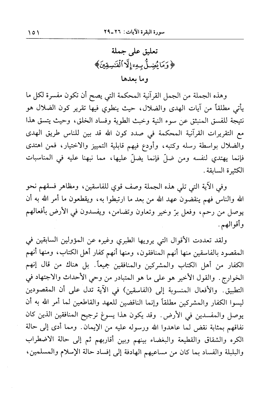 تعليق على جملة وَما يُضِلُّ بِهِ إِلَّا الْفاسِقِينَ وما بعدها