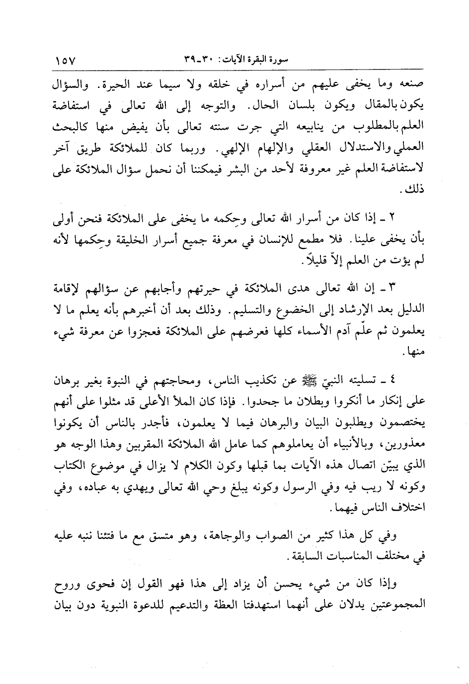 2- إذا كان من أسرار الله تعالى وحكمه ما يخفى على الملائكة فنحن أولى بأن يخفى علينا. فلا مطمع للإنسان في معرفة جميع أسرار الخليقة وحكمها لأنه لم يؤت من العلم إلّا قليلا.