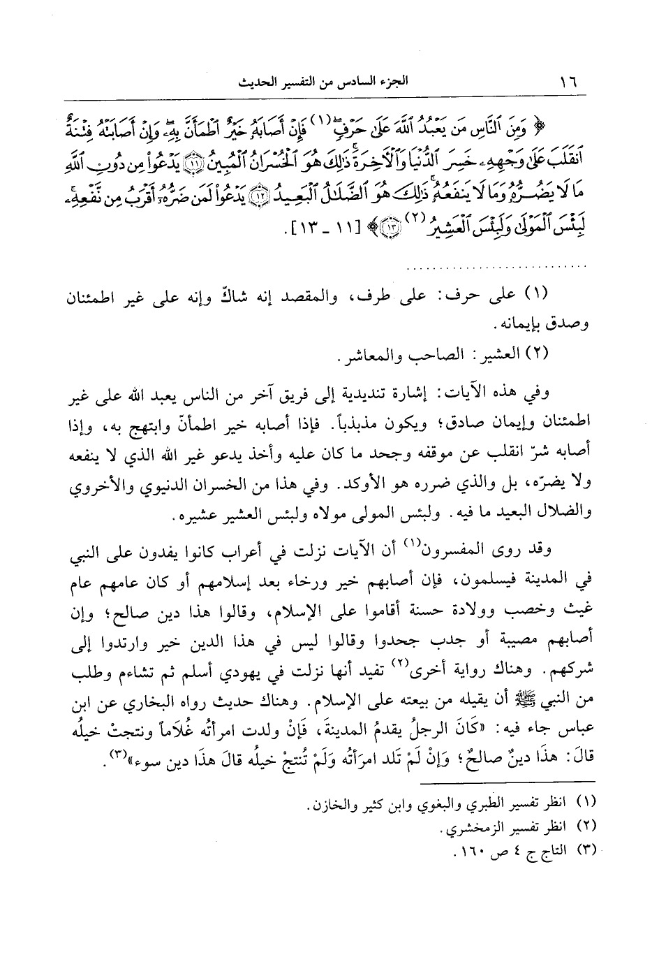 . (1) على حرف: على طرف، والمقصد إنه شاكّ وإنه على غير اطمئنان وصدق بإيمانه.