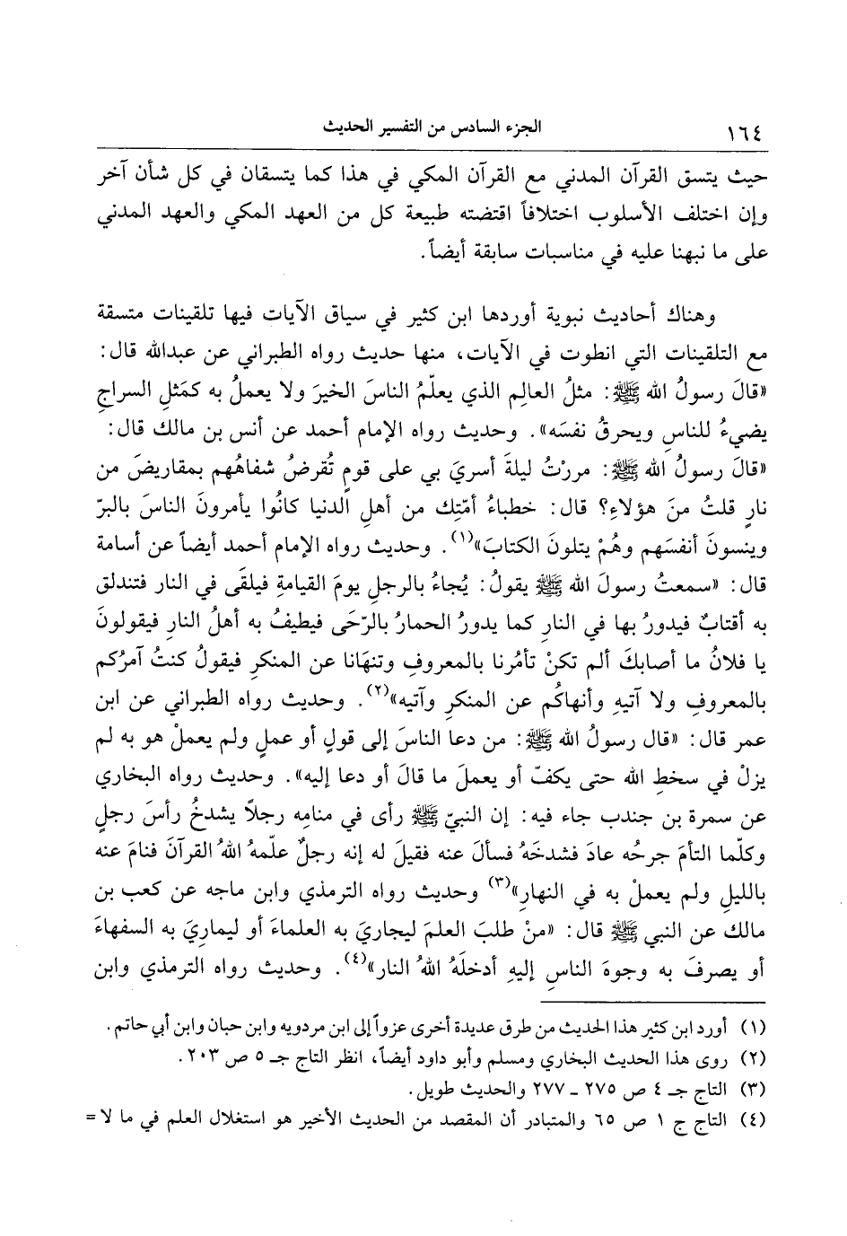 (4) التاج ج 1 ص 65 والمتبادر أن المقصد من الحديث الأخير هو استغلال العلم في ما لا يرضي الله تعالى أو في معصيته أما من يتعلم العلم وينتفع به في شأن من شؤون الدنيا المباحة ولا يكون في ذلك معصية ولا إهمال لجانب الله وتقواه فالمتبادر أنه لا يدخل في شمول الإنذار النبوي والله أعلم.