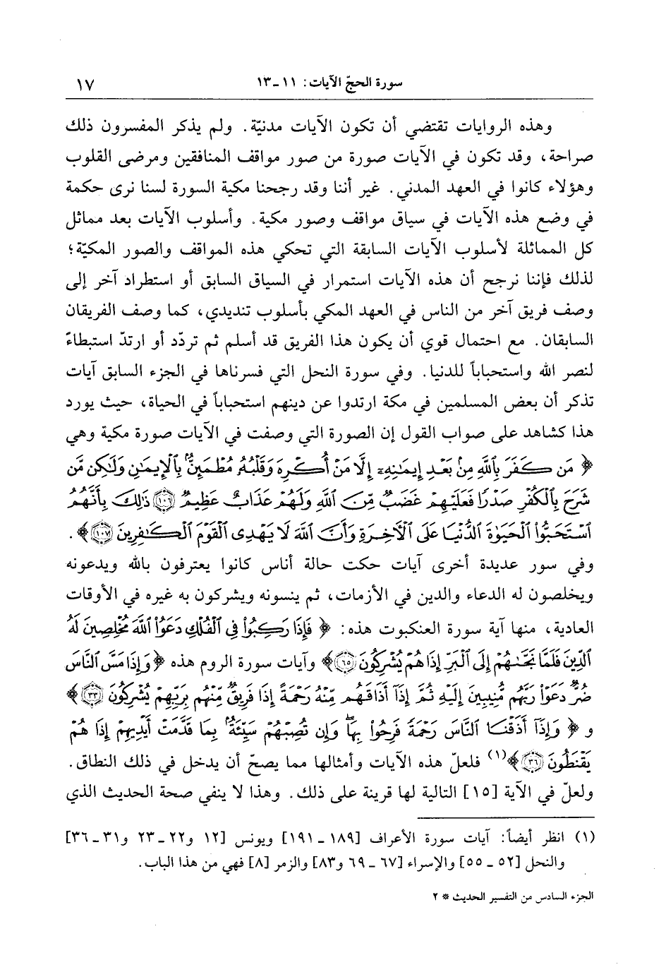 وهذه الروايات تقتضي أن تكون الآيات مدنيّة. ولم يذكر المفسرون ذلك صراحة، وقد تكون في الآيات صورة من صور مواقف المنافقين ومرضى القلوب وهؤلاء كانوا في العهد المدني. غير أننا وقد رجحنا مكية السورة لسنا نرى حكمة في وضع هذه الآيات في سياق مواقف وصور مكية. وأسلوب الآيات بعد مماثل كل المماثلة لأسلوب الآيات السابقة التي تحكي هذه المواقف والصور المكيّة لذلك فإننا نرجح أن هذه الآيات استمرار في السياق السابق أو استطراد آخر إلى وصف فريق آخر من الناس في العهد المكي بأسلوب تنديدي، كما وصف الفريقان السابقان. مع احتمال قوي أن يكون هذا الفريق قد أسلم ثم تردّد أو ارتدّ استبطاء لنصر الله واستحبابا للدنيا. وفي سورة النحل التي فسرناها في الجزء السابق آيات تذكر أن بعض المسلمين في مكة ارتدوا عن دينهم استحبابا في الحياة، حيث يورد هذا كشاهد على صواب القول إن الصورة التي وصفت في الآيات صورة مكية وهي مَنْ كَفَرَ بِاللَّهِ مِنْ بَعْدِ إِيمانِهِ إِلَّا مَنْ أُكْرِهَ وَقَلْبُهُ مُطْمَئِنٌّ بِالْإِيمانِ وَلكِنْ مَنْ شَرَحَ بِالْكُفْرِ صَدْراً فَعَلَيْهِمْ غَضَبٌ مِنَ اللَّهِ وَلَهُمْ عَذابٌ عَظِيمٌ (106) ذلِكَ بِأَنَّهُمُ اسْتَحَبُّوا الْحَياةَ الدُّنْيا عَلَى الْآخِرَةِ وَأَنَّ اللَّهَ لا يَهْدِي الْقَوْمَ الْكافِرِينَ (107) .