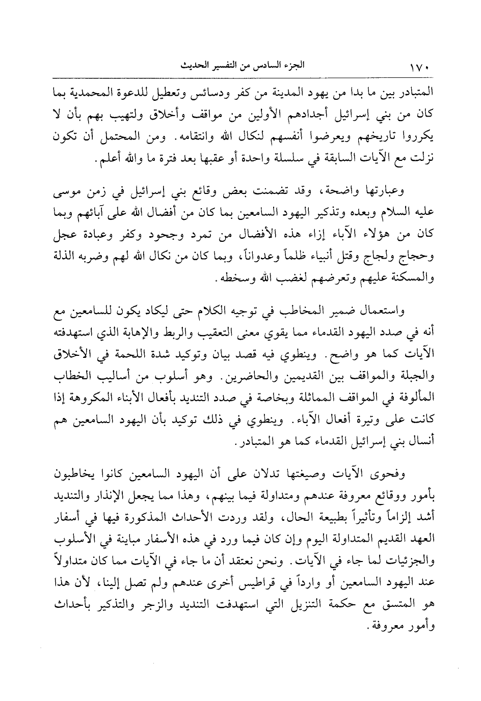 وفحوى الآيات وصيغتها تدلان على أن اليهود السامعين كانوا يخاطبون بأمور ووقائع معروفة عندهم ومتداولة فيما بينهم، وهذا مما يجعل الإنذار والتنديد أشد إلزاما وتأثيرا بطبيعة الحال، ولقد وردت الأحداث المذكورة فيها في أسفار العهد القديم المتداولة اليوم وإن كان فيما ورد في هذه الأسفار مباينة في الأسلوب والجزئيات لما جاء في الآيات. ونحن نعتقد أن ما جاء في الآيات مما كان متداولا عند اليهود السامعين أو واردا في قراطيس أخرى عندهم ولم تصل إلينا، لأن هذا هو المتسق مع حكمة التنزيل التي استهدفت التنديد والزجر والتذكير بأحداث وأمور معروفة.