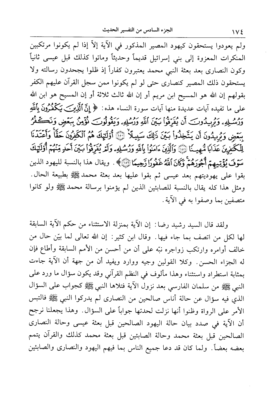 ولم يعودوا يستحقون كيهود المصير المذكور في الآية إلّا إذا لم يكونوا مرتكبين المنكرات المعزوة إلى بني إسرائيل قديما وحديثا وماتوا كذلك قبل عيسى ثانيا وكون النصارى بعد بعثة النبي محمد يعتبرون كفارا إذ ظلوا يجحدون رسالته ولا يستحقون ذلك المصير كنصارى حتى لو لم يكونوا ممن سجل القرآن عليهم الكفر بقولهم إن الله هو المسيح ابن مريم أو إن الله ثالث ثلاثة أو إن المسيح هو ابن الله على ما تفيده آيات عديدة منها آيات سورة النساء هذه: إِنَّ الَّذِينَ يَكْفُرُونَ بِاللَّهِ وَرُسُلِهِ وَيُرِيدُونَ أَنْ يُفَرِّقُوا بَيْنَ اللَّهِ وَرُسُلِهِ وَيَقُولُونَ نُؤْمِنُ بِبَعْضٍ وَنَكْفُرُ بِبَعْضٍ وَيُرِيدُونَ أَنْ يَتَّخِذُوا بَيْنَ ذلِكَ سَبِيلًا (150) أُولئِكَ هُمُ الْكافِرُونَ حَقًّا وَأَعْتَدْنا لِلْكافِرِينَ عَذاباً مُهِيناً (151) وَالَّذِينَ آمَنُوا بِاللَّهِ وَرُسُلِهِ وَلَمْ يُفَرِّقُوا بَيْنَ أَحَدٍ مِنْهُمْ أُولئِكَ سَوْفَ يُؤْتِيهِمْ أُجُورَهُمْ وَكانَ اللَّهُ غَفُوراً رَحِيماً (152) . ويقال هذا بالنسبة لليهود الذين بقوا على يهوديتهم بعد عيسى ثم بقوا عليها بعد بعثة محمد صلّى الله عليه وسلّم بطبيعة الحال.
