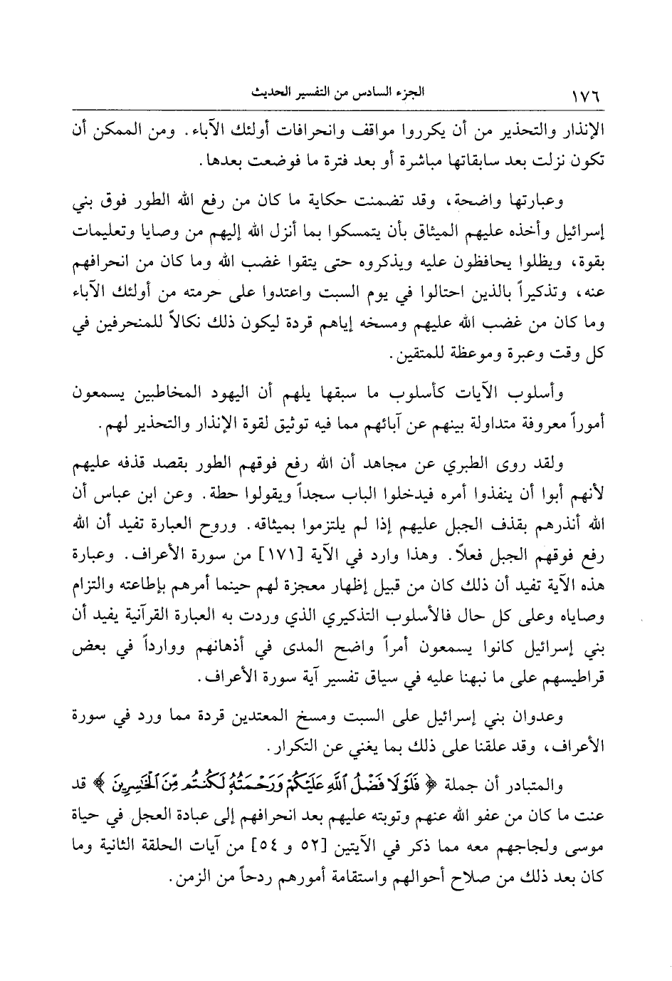 وعبارتها واضحة، وقد تضمنت حكاية ما كان من رفع الله الطور فوق بني إسرائيل وأخذه عليهم الميثاق بأن يتمسكوا بما أنزل الله إليهم من وصايا وتعليمات بقوة، ويظلوا يحافظون عليه ويذكروه حتى يتقوا غضب الله وما كان من انحرافهم عنه، وتذكيرا بالذين احتالوا في يوم السبت واعتدوا على حرمته من أولئك الآباء وما كان من غضب الله عليهم ومسخه إياهم قردة ليكون ذلك نكالا للمنحرفين في كل وقت وعبرة وموعظة للمتقين.