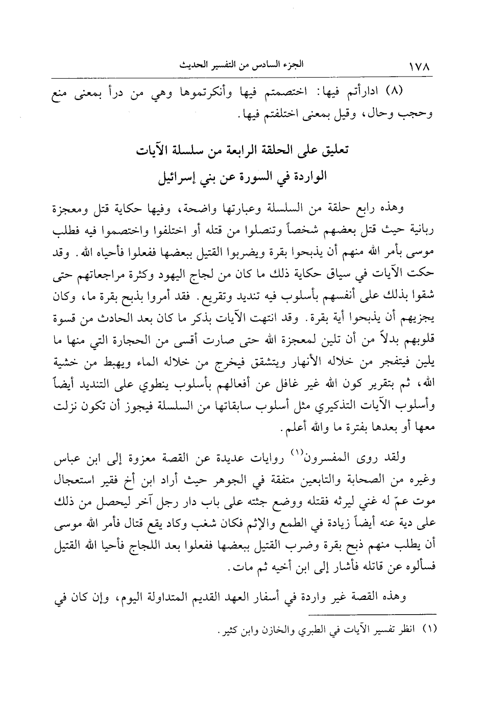 وهذه رابع حلقة من السلسلة وعبارتها واضحة، وفيها حكاية قتل ومعجزة ربانية حيث قتل بعضهم شخصا وتنصلوا من قتله أو اختلفوا واختصموا فيه فطلب موسى بأمر الله منهم أن يذبحوا بقرة ويضربوا القتيل ببعضها ففعلوا فأحياه الله. وقد حكت الآيات في سياق حكاية ذلك ما كان من لجاج اليهود وكثرة مراجعاتهم حتى شقوا بذلك على أنفسهم بأسلوب فيه تنديد وتقريع. فقد أمروا بذبح بقرة ما، وكان يجزيهم أن يذبحوا أية بقرة. وقد انتهت الآيات بذكر ما كان بعد الحادث من قسوة قلوبهم بدلا من أن تلين لمعجزة الله حتى صارت أقسى من الحجارة التي منها ما يلين فيتفجر من خلاله الأنهار ويتشقق فيخرج من خلاله الماء ويهبط من خشية الله، ثم بتقرير كون الله غير غافل عن أفعالهم بأسلوب ينطوي على التنديد أيضا وأسلوب الآيات التذكيري مثل أسلوب سابقاتها من السلسلة فيجوز أن تكون نزلت معها أو بعدها بفترة ما والله أعلم.