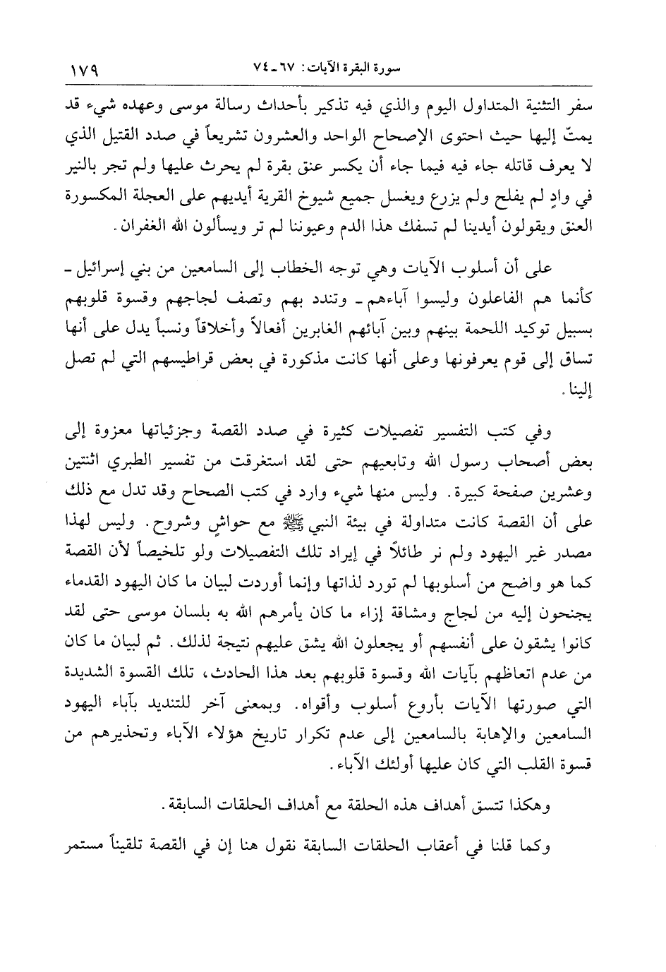 وفي كتب التفسير تفصيلات كثيرة في صدد القصة وجزئياتها معزوة إلى بعض أصحاب رسول الله وتابعيهم حتى لقد استغرقت من تفسير الطبري اثنتين وعشرين صفحة كبيرة. وليس منها شيء وارد في كتب الصحاح وقد تدل مع ذلك على أن القصة كانت متداولة في بيئة النبي صلّى الله عليه وسلّم مع حواش وشروح. وليس لهذا مصدر غير اليهود ولم نر طائلا في إيراد تلك التفصيلات ولو تلخيصا لأن القصة كما هو واضح من أسلوبها لم تورد لذاتها وإنما أوردت لبيان ما كان اليهود القدماء يجنحون إليه من لجاج ومشاقة إزاء ما كان يأمرهم الله به بلسان موسى حتى لقد كانوا يشقون على أنفسهم أو يجعلون الله يشق عليهم نتيجة لذلك. ثم لبيان ما كان من عدم اتعاظهم بآيات الله وقسوة قلوبهم بعد هذا الحادث، تلك القسوة الشديدة التي صورتها الآيات بأروع أسلوب وأقواه. وبمعنى آخر للتنديد بآباء اليهود السامعين والإهابة بالسامعين إلى عدم تكرار تاريخ هؤلاء الآباء وتحذيرهم من قسوة القلب التي كان عليها أولئك الآباء.