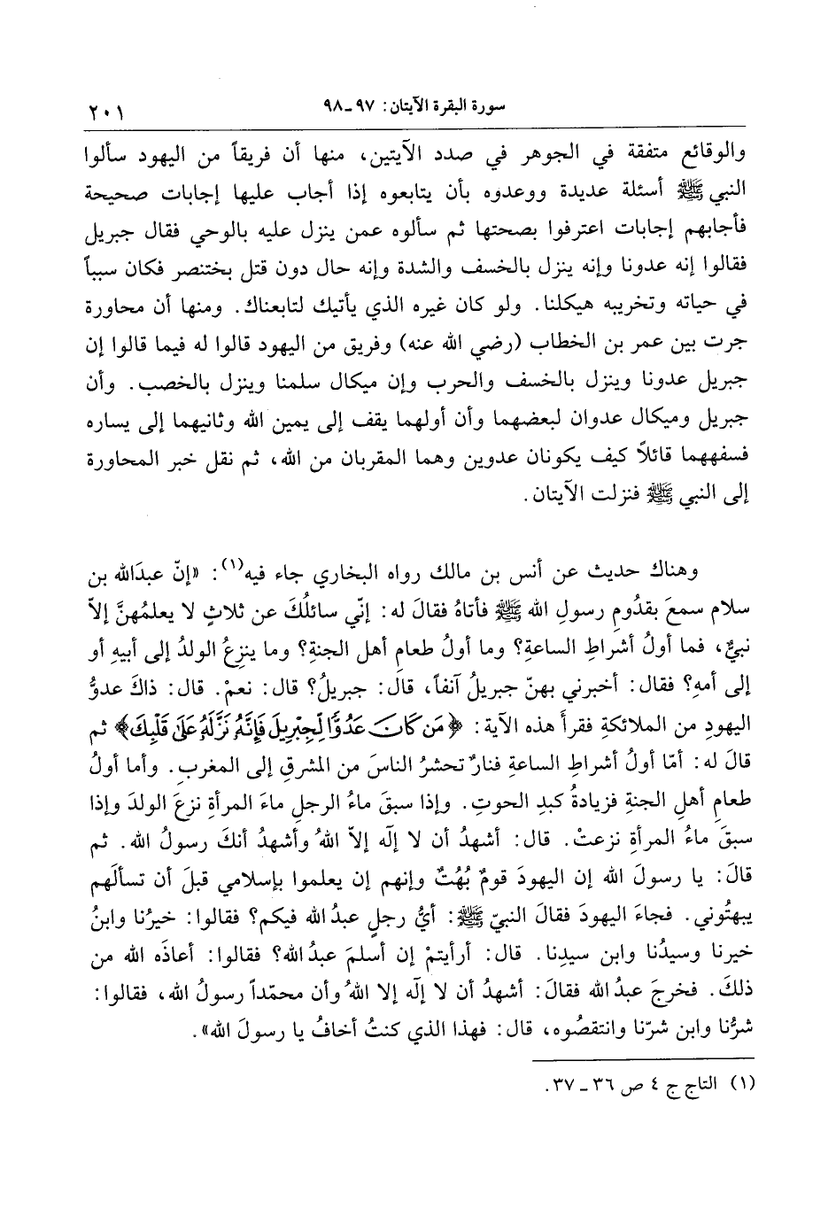 وهناك حديث عن أنس بن مالك رواه البخاري جاء فيه «1» : «إنّ عبد الله بن سلام سمع بقدوم رسول الله صلّى الله عليه وسلّم فأتاه فقال له: إنّي سائلك عن ثلاث لا يعلمهنّ إلّا نبيّ، فما أول أشراط الساعة؟ وما أول طعام أهل الجنة؟ وما ينزع الولد إلى أبيه أو إلى أمه؟ فقال: أخبرني بهنّ جبريل آنفا، قال: جبريل؟ قال: نعم. قال: ذاك عدوّ اليهود من الملائكة فقرأ هذه الآية: مَنْ كانَ عَدُوًّا لِجِبْرِيلَ فَإِنَّهُ نَزَّلَهُ عَلى قَلْبِكَ ثم قال له: أمّا أول أشراط الساعة فنار تحشر الناس من المشرق إلى المغرب. وأما أول طعام أهل الجنة فزيادة كبد الحوت. وإذا سبق ماء الرجل ماء المرأة نزع الولد وإذا سبق ماء المرأة نزعت. قال: أشهد أن لا إله إلّا الله وأشهد أنك رسول الله. ثم قال: يا رسول الله إن اليهود قوم بهت وإنهم إن يعلموا بإسلامي قبل أن تسألهم يبهتوني. فجاء اليهود فقال النبيّ صلّى الله عليه وسلّم: أيّ رجل عبد الله فيكم؟ فقالوا: خيرنا وابن خيرنا وسيدنا وابن سيدنا. قال: أرأيتم إن أسلم عبد الله؟ فقالوا: أعاذه الله من ذلك. فخرج عبد الله فقال: أشهد أن لا إله إلا الله وأن محمّدا رسول الله، فقالوا: