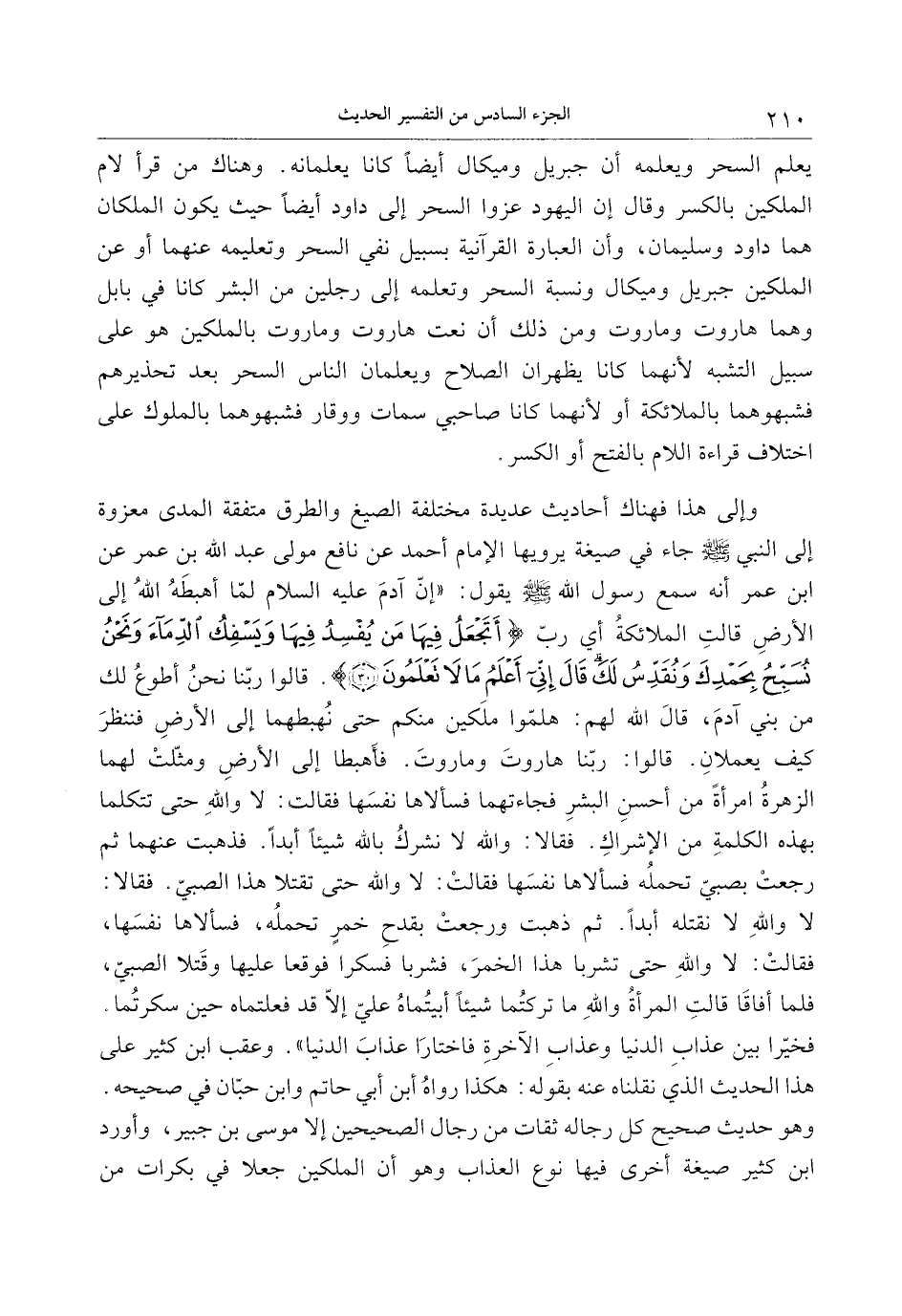 وإلى هذا فهناك أحاديث عديدة مختلفة الصيغ والطرق متفقة المدى معزوة إلى النبي صلّى الله عليه وسلّم جاء في صيغة يرويها الإمام أحمد عن نافع مولى عبد الله بن عمر عن ابن عمر أنه سمع رسول الله صلّى الله عليه وسلّم يقول: «إنّ آدم عليه السلام لمّا أهبطه الله إلى الأرض قالت الملائكة أي ربّ أَتَجْعَلُ فِيها مَنْ يُفْسِدُ فِيها وَيَسْفِكُ الدِّماءَ وَنَحْنُ نُسَبِّحُ بِحَمْدِكَ وَنُقَدِّسُ لَكَ قالَ إِنِّي أَعْلَمُ ما لا تَعْلَمُونَ (30) . قالوا ربّنا نحن أطوع لك من بني آدم، قال الله لهم: هلمّوا ملكين منكم حتى نهبطهما إلى الأرض فننظر كيف يعملان. قالوا: ربّنا هاروت وماروت. فأهبطا إلى الأرض ومثّلت لهما الزهرة امرأة من أحسن البشر فجاءتهما فسألاها نفسها فقالت: لا والله حتى تتكلما بهذه الكلمة من الإشراك. فقالا: والله لا نشرك بالله شيئا أبدا. فذهبت عنهما ثم رجعت بصبيّ تحمله فسألاها نفسها فقالت: لا والله حتى تقتلا هذا الصبيّ. فقالا: