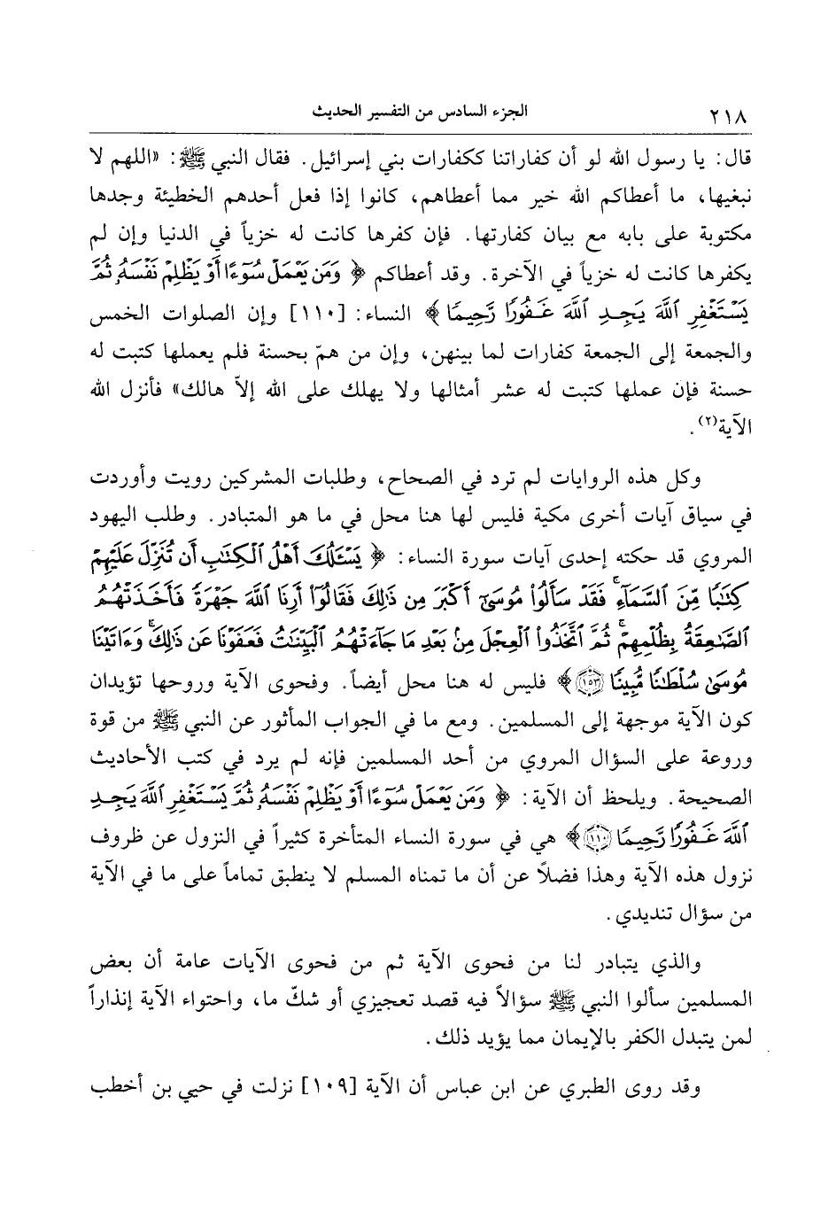 فليس له هنا محل أيضا. وفحوى الآية وروحها تؤيدان كون الآية موجهة إلى المسلمين. ومع ما في الجواب المأثور عن النبي صلّى الله عليه وسلّم من قوة وروعة على السؤال المروي من أحد المسلمين فإنه لم يرد في كتب الأحاديث الصحيحة. ويلحظ أن الآية: وَمَنْ يَعْمَلْ سُوءاً أَوْ يَظْلِمْ نَفْسَهُ ثُمَّ يَسْتَغْفِرِ اللَّهَ يَجِدِ اللَّهَ غَفُوراً رَحِيماً (110)