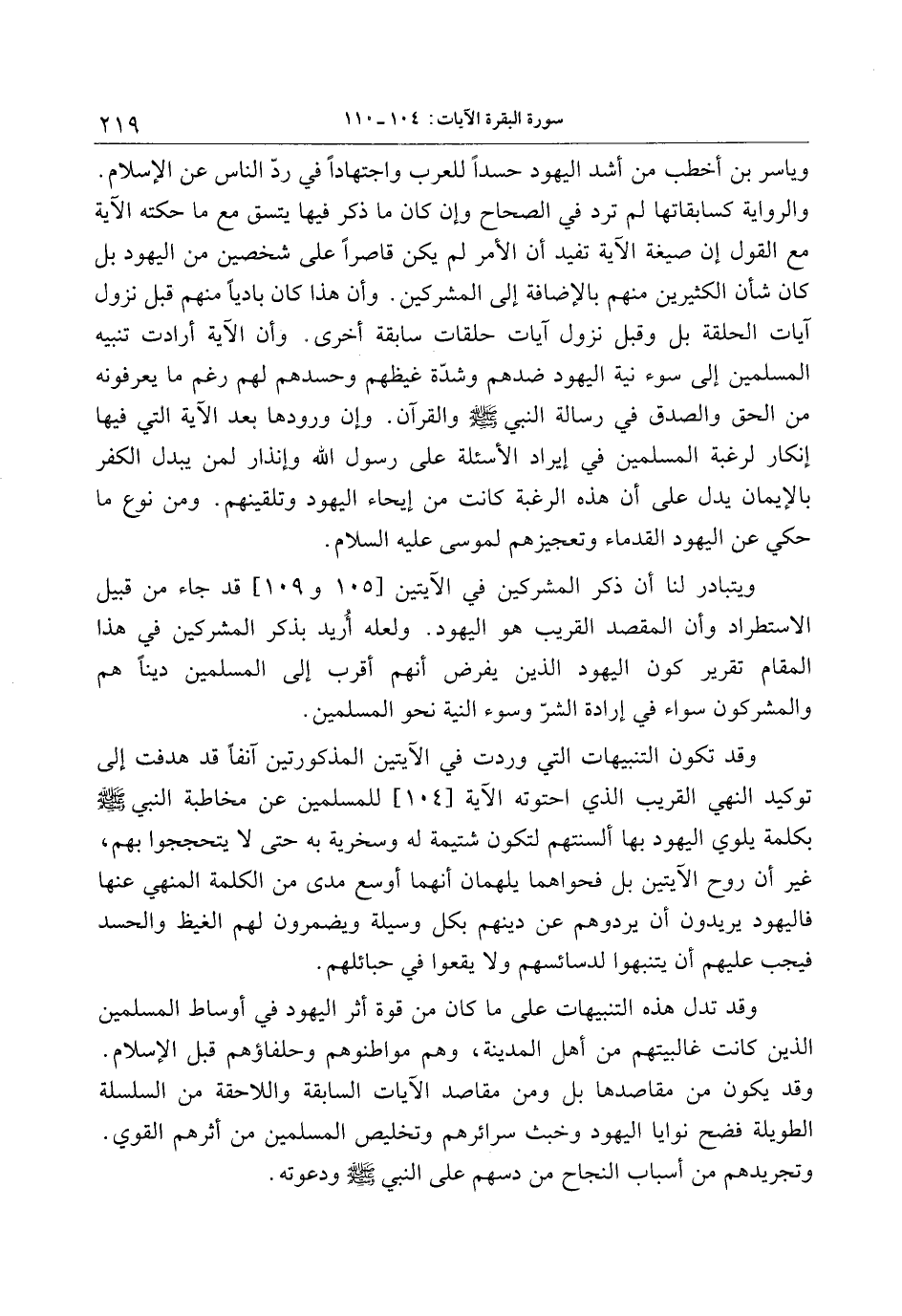 وقد تكون التنبيهات التي وردت في الآيتين المذكورتين آنفا قد هدفت إلى توكيد النهي القريب الذي احتوته الآية [104] للمسلمين عن مخاطبة النبي صلّى الله عليه وسلّم بكلمة يلوي اليهود بها ألسنتهم لتكون شتيمة له وسخرية به حتى لا يتحججوا بهم، غير أن روح الآيتين بل فحواهما يلهمان أنهما أوسع مدى من الكلمة المنهي عنها فاليهود يريدون أن يردوهم عن دينهم بكل وسيلة ويضمرون لهم الغيظ والحسد فيجب عليهم أن يتنبهوا لدسائسهم ولا يقعوا في حبائلهم.
