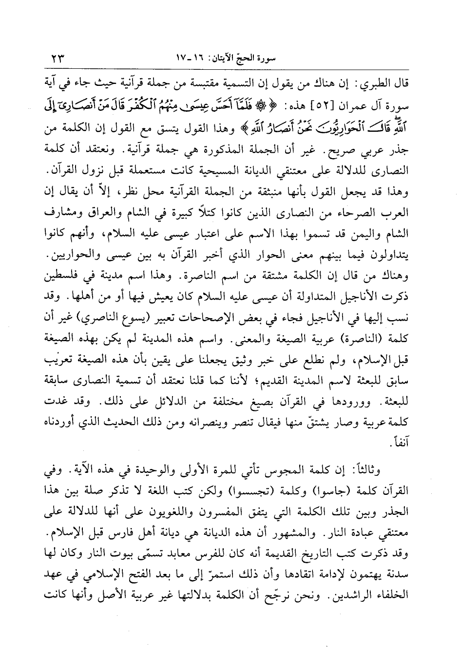 وثالثا: إن كلمة المجوس تأتي للمرة الأولى والوحيدة في هذه الآية. وفي القرآن كلمة (جاسوا) وكلمة (تجسسوا) ولكن كتب اللغة لا تذكر صلة بين هذا الجذر وبين تلك الكلمة التي يتفق المفسرون واللغويون على أنها للدلالة على معتنقي عبادة النار. والمشهور أن هذه الديانة هي ديانة أهل فارس قبل الإسلام.