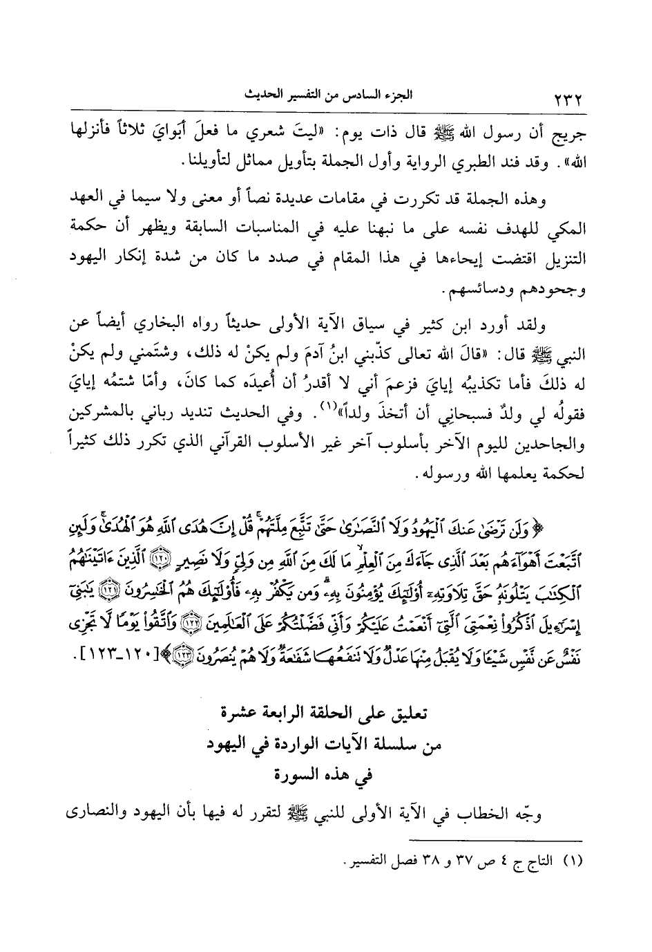 وَلَنْ تَرْضى عَنْكَ الْيَهُودُ وَلا النَّصارى حَتَّى تَتَّبِعَ مِلَّتَهُمْ قُلْ إِنَّ هُدَى اللَّهِ هُوَ الْهُدى وَلَئِنِ اتَّبَعْتَ أَهْواءَهُمْ بَعْدَ الَّذِي جاءَكَ مِنَ الْعِلْمِ ما لَكَ مِنَ اللَّهِ مِنْ وَلِيٍّ وَلا نَصِيرٍ (120) الَّذِينَ آتَيْناهُمُ الْكِتابَ يَتْلُونَهُ حَقَّ تِلاوَتِهِ أُولئِكَ يُؤْمِنُونَ بِهِ وَمَنْ يَكْفُرْ بِهِ فَأُولئِكَ هُمُ الْخاسِرُونَ (121) يا بَنِي إِسْرائِيلَ اذْكُرُوا نِعْمَتِيَ الَّتِي أَنْعَمْتُ عَلَيْكُمْ وَأَنِّي فَضَّلْتُكُمْ عَلَى الْعالَمِينَ (122) وَاتَّقُوا يَوْماً لا تَجْزِي نَفْسٌ عَنْ نَفْسٍ شَيْئاً وَلا يُقْبَلُ مِنْها عَدْلٌ وَلا تَنْفَعُها شَفاعَةٌ وَلا هُمْ يُنْصَرُونَ (123)