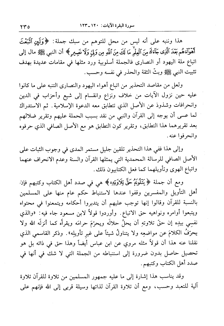 ومع أن جملة يَتْلُونَهُ حَقَّ تِلاوَتِهِ هي في صدد أهل الكتاب وكتبهم فإن أهل التأويل والمفسرين وقفوا عندها لاستنباط حكم عام منها على المسلمين بالنسبة للقرآن وقالوا إنها توجب عليهم أن يتدبروا أحكامه ويتمعنوا في محتواه ويتبعوا أوامره ونواهيه حق الاتباع. وأوردوا قولا لابن مسعود جاء فيه: «والذي نفسي بيده إن حقّ تلاوته أن يحلّ حلاله ويحرّم حرامه ويقرأه كما أنزله الله ولا يحرّف الكلام عن مواضعه ولا يتناول شيئا على غير تأويله» . وذكر القاسمي الذي نقلنا عنه هذا أن قولا مثله مروي عن ابن عباس أيضا وهذا حق في ذاته بل هو تحصيل حاصل بدون ضرورة إلى استنباطه من الجملة التي لا شك في أنها في صدد أهل الكتاب وكتبهم.