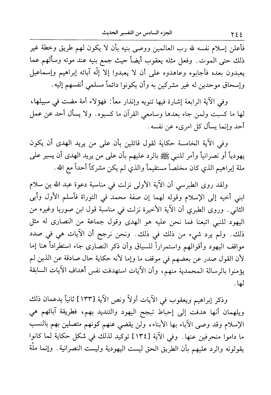 وذكر إبراهيم ويعقوب في الآيات أولا ونص الآية [133] ثانيا يدعمان ذلك ويلهمان أنها هدفت إلى إحباط تبجح اليهود والتنديد بهم، فطريقة آبائهم هي الإسلام وقد وصى الآباء بها الأبناء، ولن يقضي عنهم كونهم متصلين بهم بالنسب ما داموا منحرفين عنها. وفي الآية [134] توكيد لذلك في شكل حكاية لما كانوا يقولونه والرد عليهم بأن الطريق الحق ليست اليهودية وليست النصرانية. وإنما ملّة