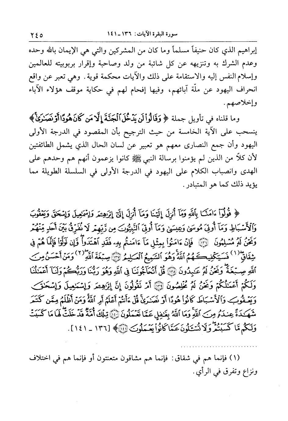 إبراهيم الذي كان حنيفا مسلما وما كان من المشركين والتي هي الإيمان بالله وحده وعدم الشرك به وتنزيهه عن كل شائبة من ولد وصاحبة وإقرار بربوبيته للعالمين وإسلام النفس إليه والاستقامة على ذلك والآيات محكمة قوية. وهي تعبر عن واقع انحراف اليهود عن ملّة آبائهم، وفيها إفحام لهم في حكاية موقف هؤلاء الآباء وإخلاصهم.