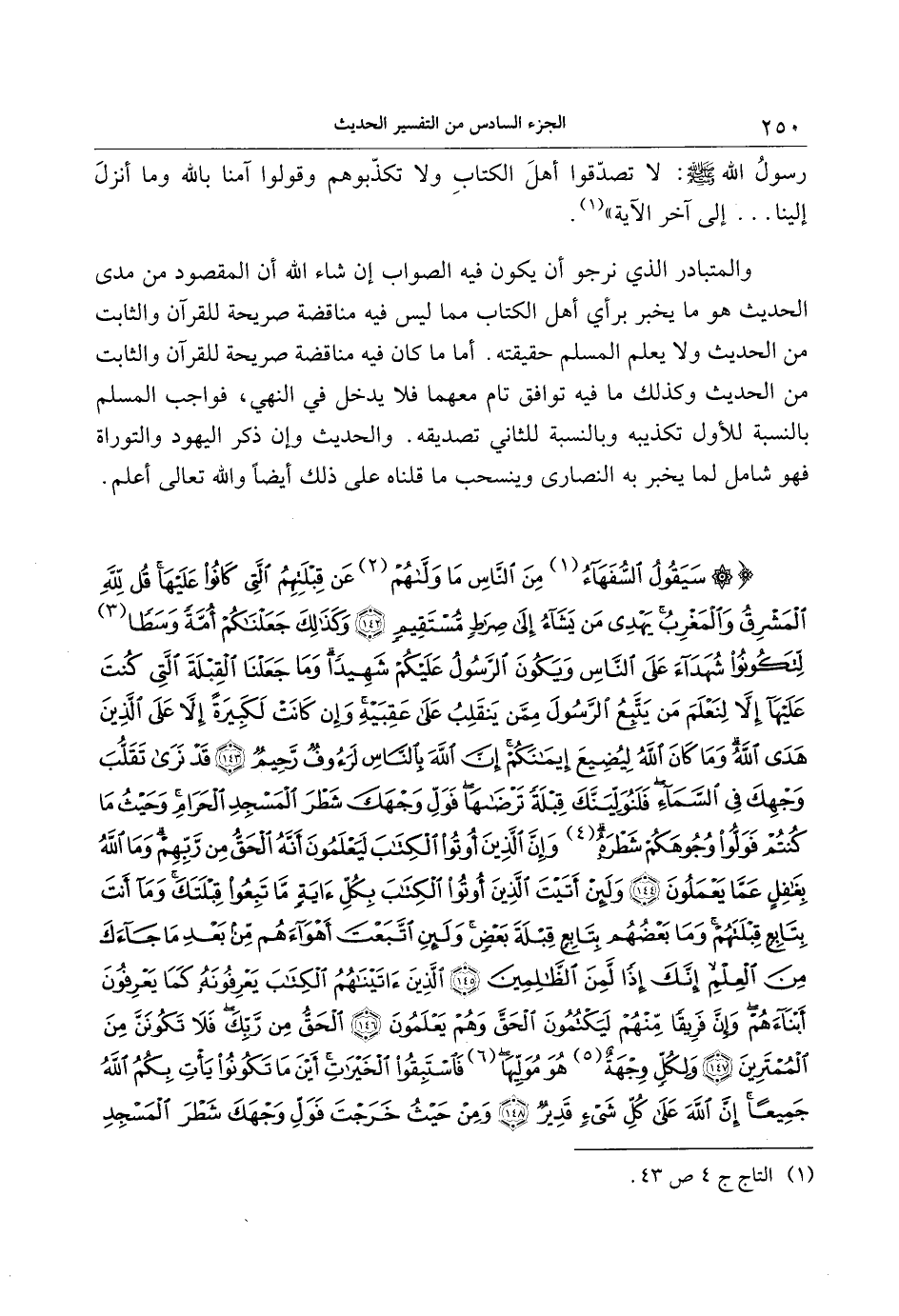 سَيَقُولُ السُّفَهاءُ مِنَ النَّاسِ ما وَلاَّهُمْ عَنْ قِبْلَتِهِمُ الَّتِي كانُوا عَلَيْها قُلْ لِلَّهِ الْمَشْرِقُ وَالْمَغْرِبُ يَهْدِي مَنْ يَشاءُ إِلى صِراطٍ مُسْتَقِيمٍ (142) وَكَذلِكَ جَعَلْناكُمْ أُمَّةً وَسَطاً لِتَكُونُوا شُهَداءَ عَلَى النَّاسِ وَيَكُونَ الرَّسُولُ عَلَيْكُمْ شَهِيداً وَما جَعَلْنَا الْقِبْلَةَ الَّتِي كُنْتَ عَلَيْها إِلاَّ لِنَعْلَمَ مَنْ يَتَّبِعُ الرَّسُولَ مِمَّنْ يَنْقَلِبُ عَلى عَقِبَيْهِ وَإِنْ كانَتْ لَكَبِيرَةً إِلاَّ عَلَى الَّذِينَ هَدَى اللَّهُ وَما كانَ اللَّهُ لِيُضِيعَ إِيمانَكُمْ إِنَّ اللَّهَ بِالنَّاسِ لَرَؤُفٌ رَحِيمٌ (143) قَدْ نَرى تَقَلُّبَ وَجْهِكَ فِي السَّماءِ فَلَنُوَلِّيَنَّكَ قِبْلَةً تَرْضاها فَوَلِّ وَجْهَكَ شَطْرَ الْمَسْجِدِ الْحَرامِ وَحَيْثُ ما كُنْتُمْ فَوَلُّوا وُجُوهَكُمْ شَطْرَهُ وَإِنَّ الَّذِينَ أُوتُوا الْكِتابَ لَيَعْلَمُونَ أَنَّهُ الْحَقُّ مِنْ رَبِّهِمْ وَمَا اللَّهُ بِغافِلٍ عَمَّا يَعْمَلُونَ (144) وَلَئِنْ أَتَيْتَ الَّذِينَ أُوتُوا الْكِتابَ بِكُلِّ آيَةٍ ما تَبِعُوا قِبْلَتَكَ وَما أَنْتَ بِتابِعٍ قِبْلَتَهُمْ وَما بَعْضُهُمْ بِتابِعٍ قِبْلَةَ بَعْضٍ وَلَئِنِ اتَّبَعْتَ أَهْواءَهُمْ مِنْ بَعْدِ ما جاءَكَ مِنَ الْعِلْمِ إِنَّكَ إِذاً لَمِنَ الظَّالِمِينَ (145) الَّذِينَ آتَيْناهُمُ الْكِتابَ يَعْرِفُونَهُ كَما يَعْرِفُونَ أَبْناءَهُمْ وَإِنَّ فَرِيقاً مِنْهُمْ لَيَكْتُمُونَ الْحَقَّ وَهُمْ يَعْلَمُونَ (146)