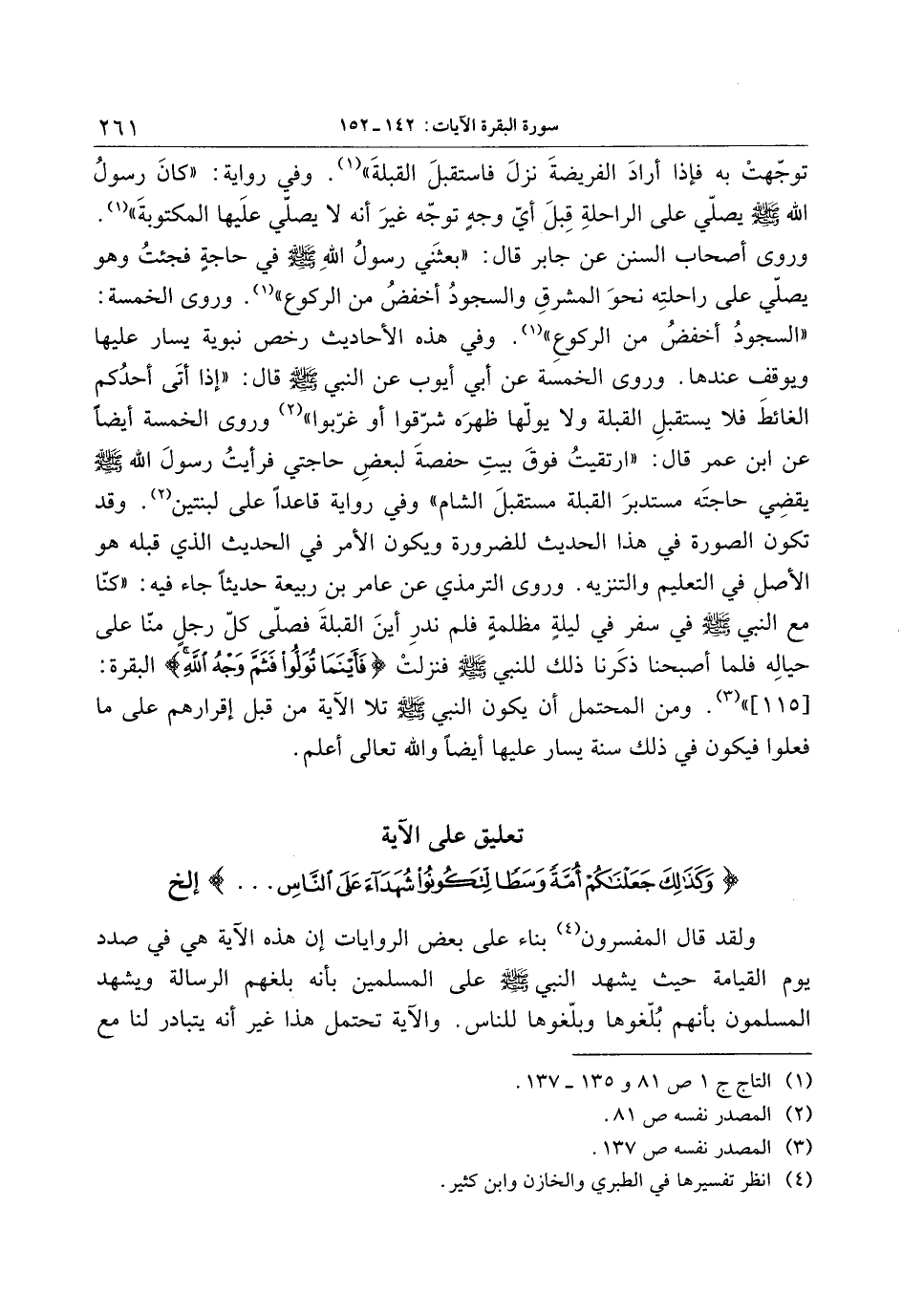 ولقد قال المفسرون «8» بناء على بعض الروايات إن هذه الآية هي في صدد يوم القيامة حيث يشهد النبي صلّى الله عليه وسلّم على المسلمين بأنه بلغهم الرسالة ويشهد المسلمون بأنهم بلّغوها وبلّغوها للناس. والآية تحتمل هذا غير أنه يتبادر لنا مع
