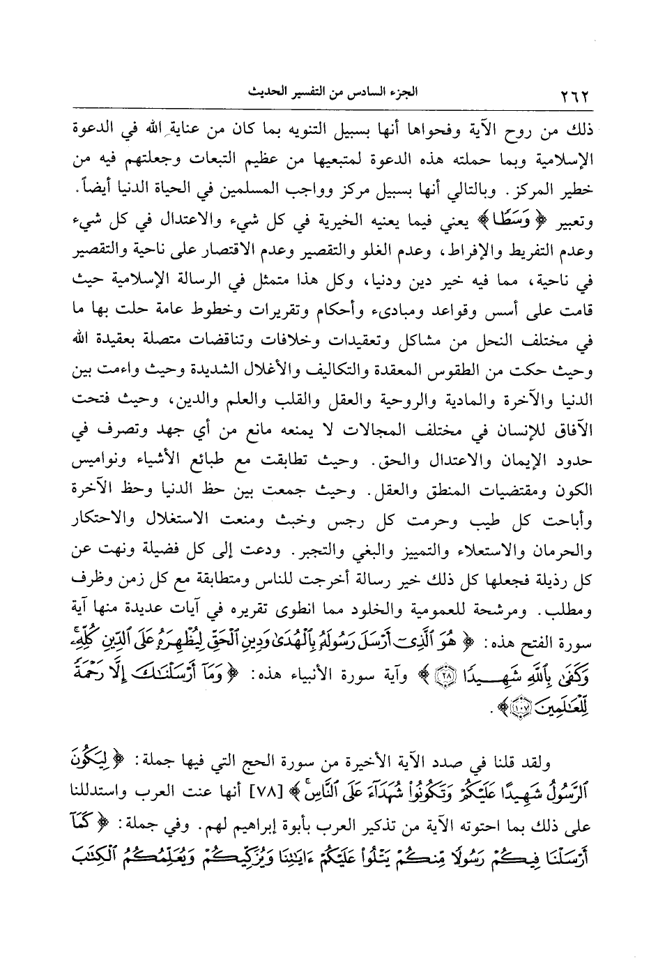 وتعبير وَسَطاً يعني فيما يعنيه الخيرية في كل شيء والاعتدال في كل شيء وعدم التفريط والإفراط، وعدم الغلو والتقصير وعدم الاقتصار على ناحية والتقصير في ناحية، مما فيه خير دين ودنيا، وكل هذا متمثل في الرسالة الإسلامية حيث قامت على أسس وقواعد ومبادئ وأحكام وتقريرات وخطوط عامة حلت بها ما في مختلف النحل من مشاكل وتعقيدات وخلافات وتناقضات متصلة بعقيدة الله وحيث حكت من الطقوس المعقدة والتكاليف والأغلال الشديدة وحيث واءمت بين الدنيا والآخرة والمادية والروحية والعقل والقلب والعلم والدين، وحيث فتحت الآفاق للإنسان في مختلف المجالات لا يمنعه مانع من أي جهد وتصرف في حدود الإيمان والاعتدال والحق. وحيث تطابقت مع طبائع الأشياء ونواميس الكون ومقتضيات المنطق والعقل. وحيث جمعت بين حظ الدنيا وحظ الآخرة وأباحت كل طيب وحرمت كل رجس وخبث ومنعت الاستغلال والاحتكار والحرمان والاستعلاء والتمييز والبغي والتجبر. ودعت إلى كل فضيلة ونهت عن كل رذيلة فجعلها كل ذلك خير رسالة أخرجت للناس ومتطابقة مع كل زمن وظرف ومطلب. ومرشحة للعمومية والخلود مما انطوى تقريره في آيات عديدة منها آية سورة الفتح هذه: هُوَ الَّذِي أَرْسَلَ رَسُولَهُ بِالْهُدى وَدِينِ الْحَقِّ لِيُظْهِرَهُ عَلَى الدِّينِ كُلِّهِ وَكَفى بِاللَّهِ شَهِيداً (28) وآية سورة الأنبياء هذه: وَما أَرْسَلْناكَ إِلَّا رَحْمَةً لِلْعالَمِينَ (107) .